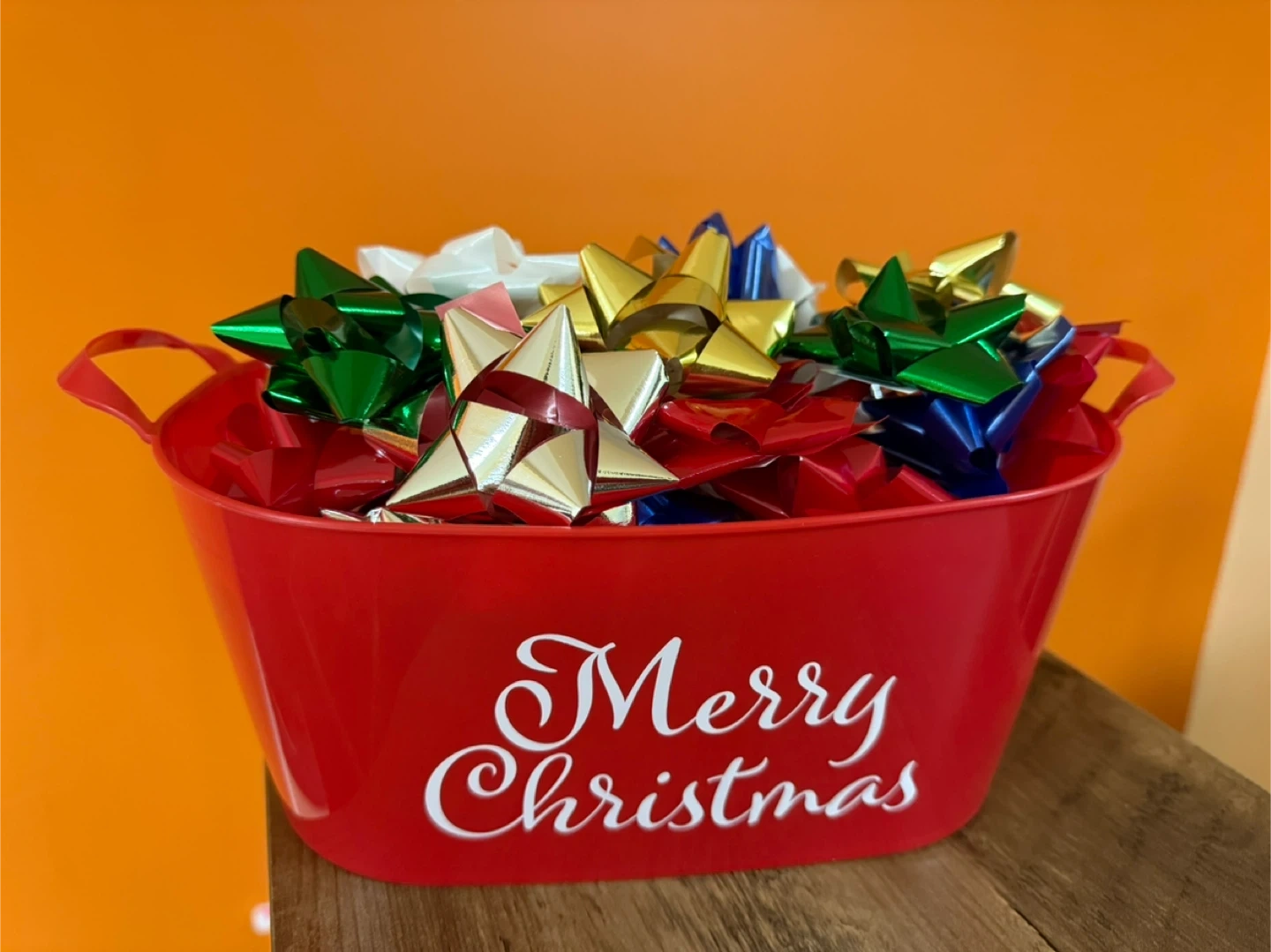 Selling a red holiday tub with 'Merry Christmas' written on the side. It's in great condition and perfect for holiday decorations or storage