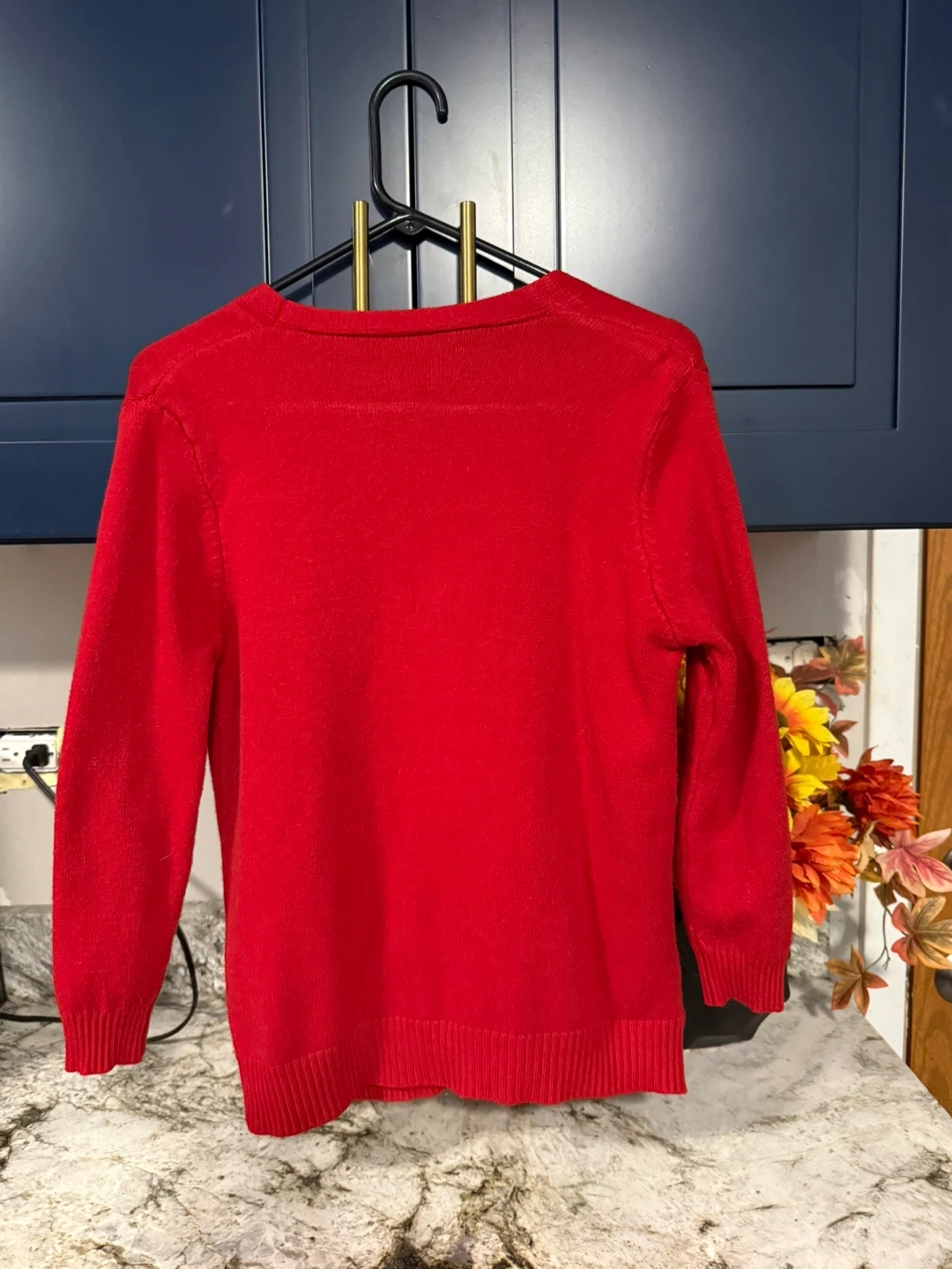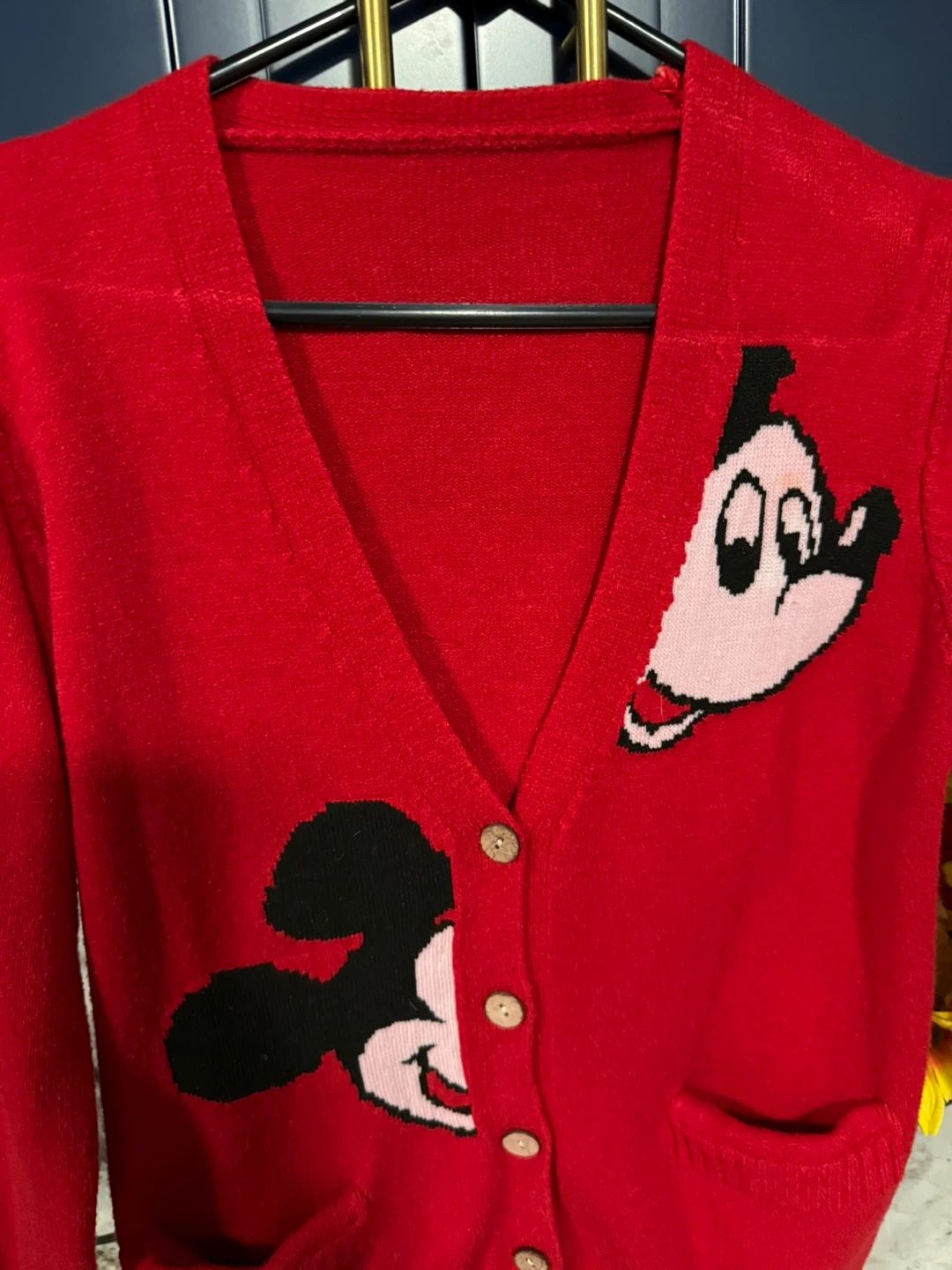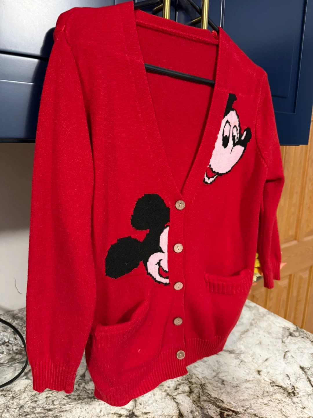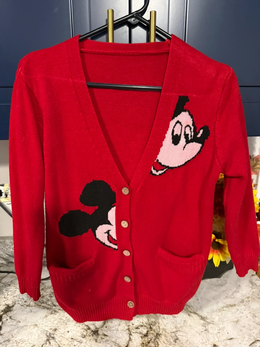 Here's a cute red cardigan with Mickey Mouse on it! It has a v-neck and buttons down the front