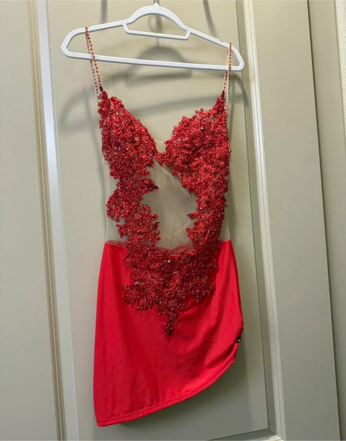 65Selling a red mini dress with beaded detailing. It's in great condition and has a unique design. Perfect for a night out or a special occasion!