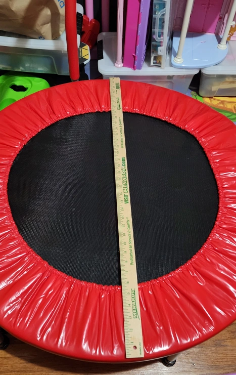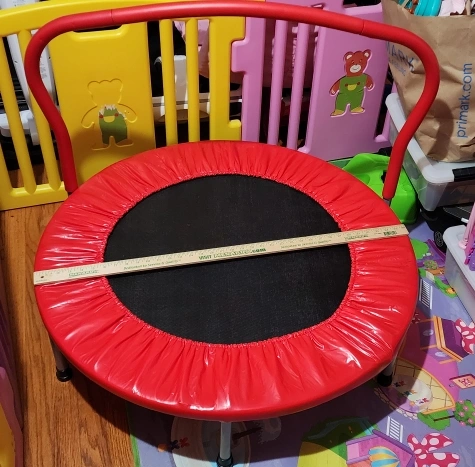 Barely used and in like new condition and ready for some fun workouts or playtime for both kids and adults! Great for both indoors and outdoors. Foam handrail (removable) to hold onto and padded frame cover. It measures approximately 3 feet in diameter and 30 inches in height. Foldable for convenient storage. Weighs about 17lb and max load weight is 175lbs.