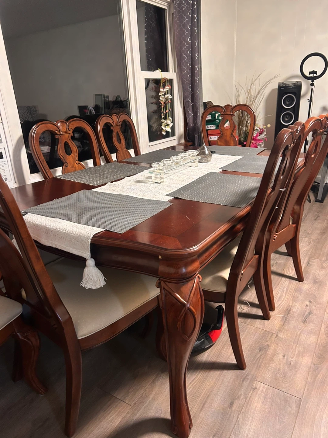 15Selling a red oak dining table with 8 chairs. The table is a dark wood The chairs have a decorative cream-colored seats. Perfect for a family or anyone who loves to entertain! I pay 3,999 at Macy’s furniture in smith heaven mall.