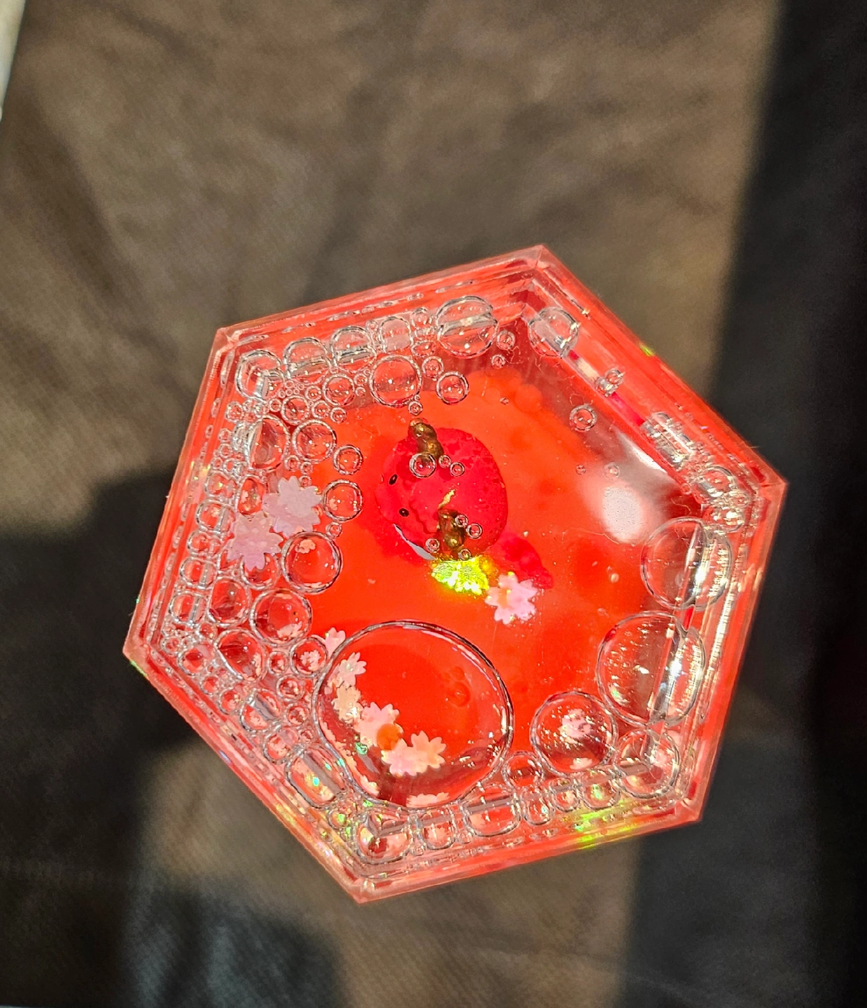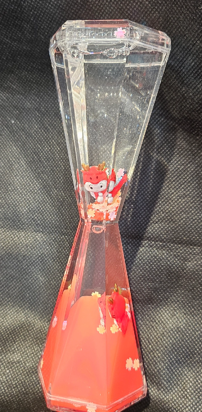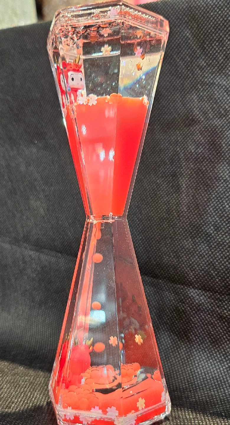 This is a red liquid motion timer. It's a fun and interesting decorative showpiece. Watch as the oil slowly drips down as the figurines flow around, the perfect addition to a desk or a shelf! Willing to negotiate.