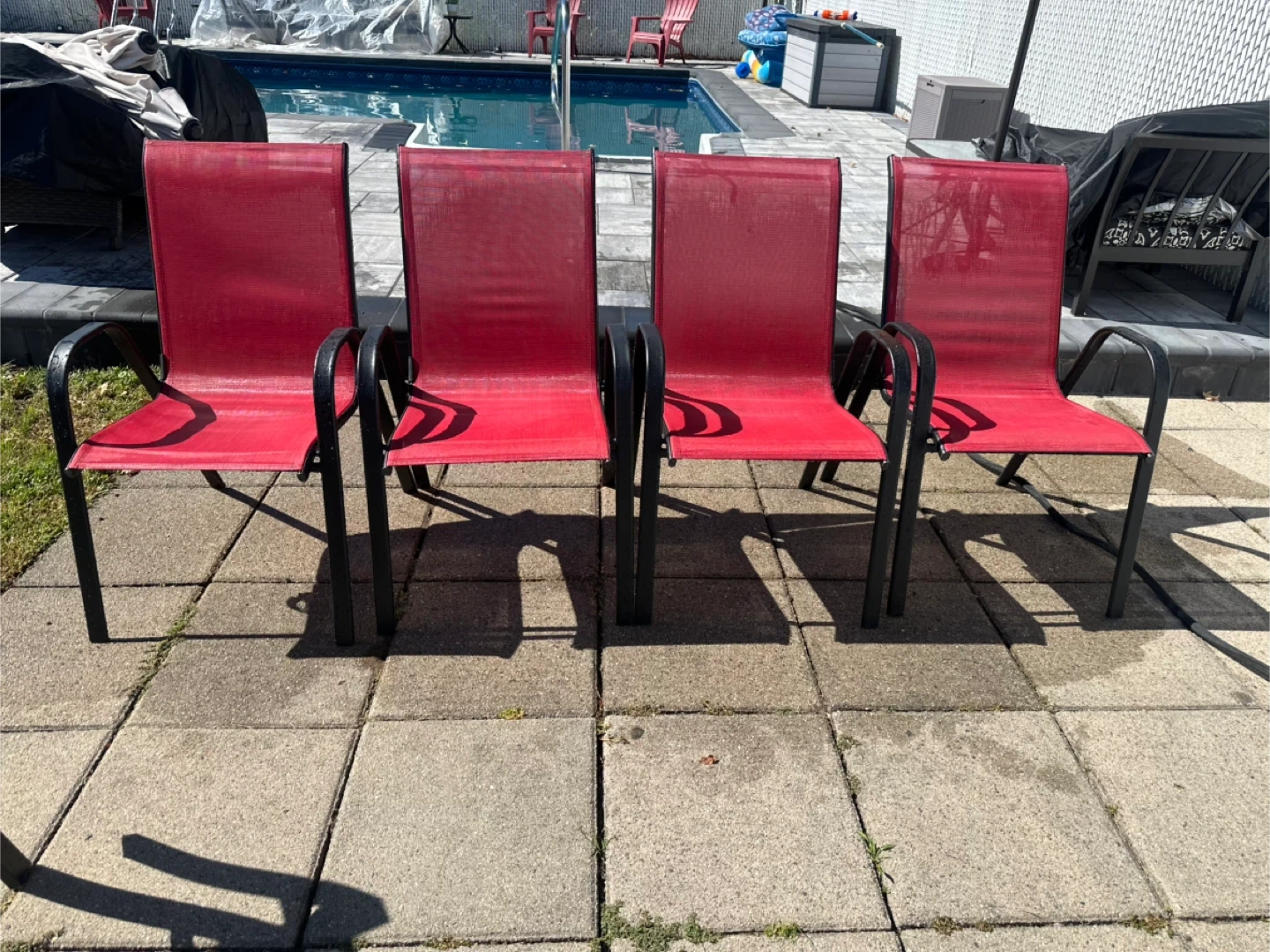 Selling a set of four red outdoor patio chairs. They're perfect for lounging by the pool or relaxing on the patio. The chairs have a sturdy black metal frame and a comfortable red mesh seat and back. Ready for a new home!
