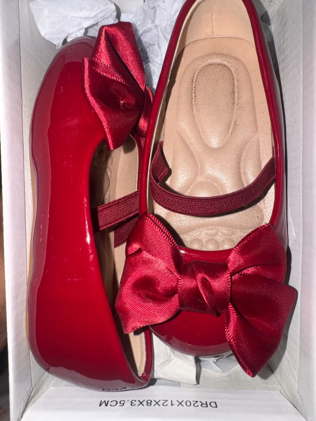 These adorable red patent leather flats feature a sweet bow detail, perfect for dressing up any outfit! They come in their original box. The shoes are in good condition and ready for a new home