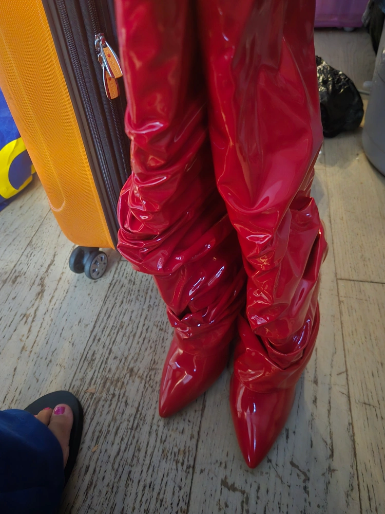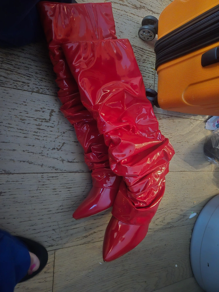 These are a pair of stunning red patent leather thigh-high boots. They're sure to make a statement and add a pop of color to any outfit!
