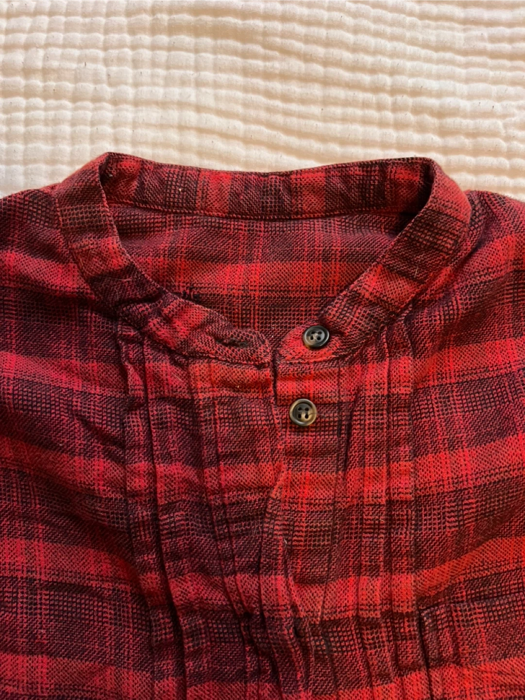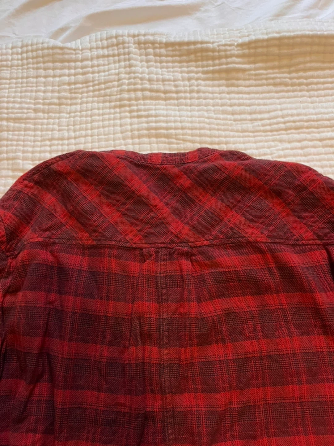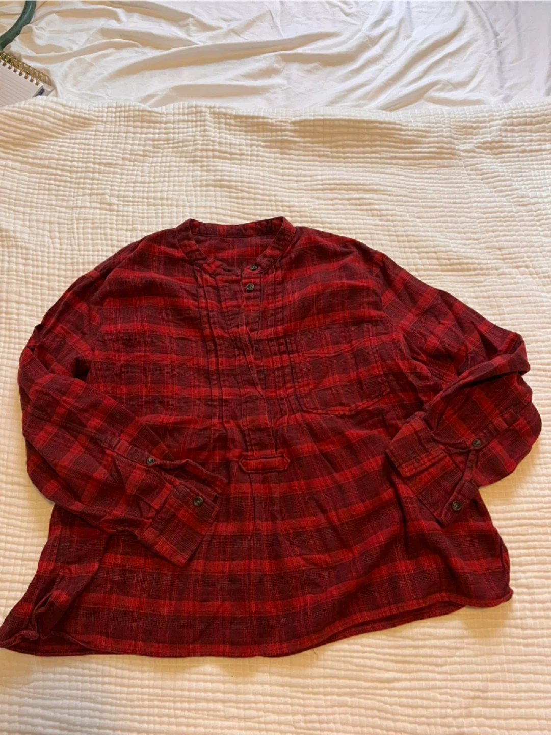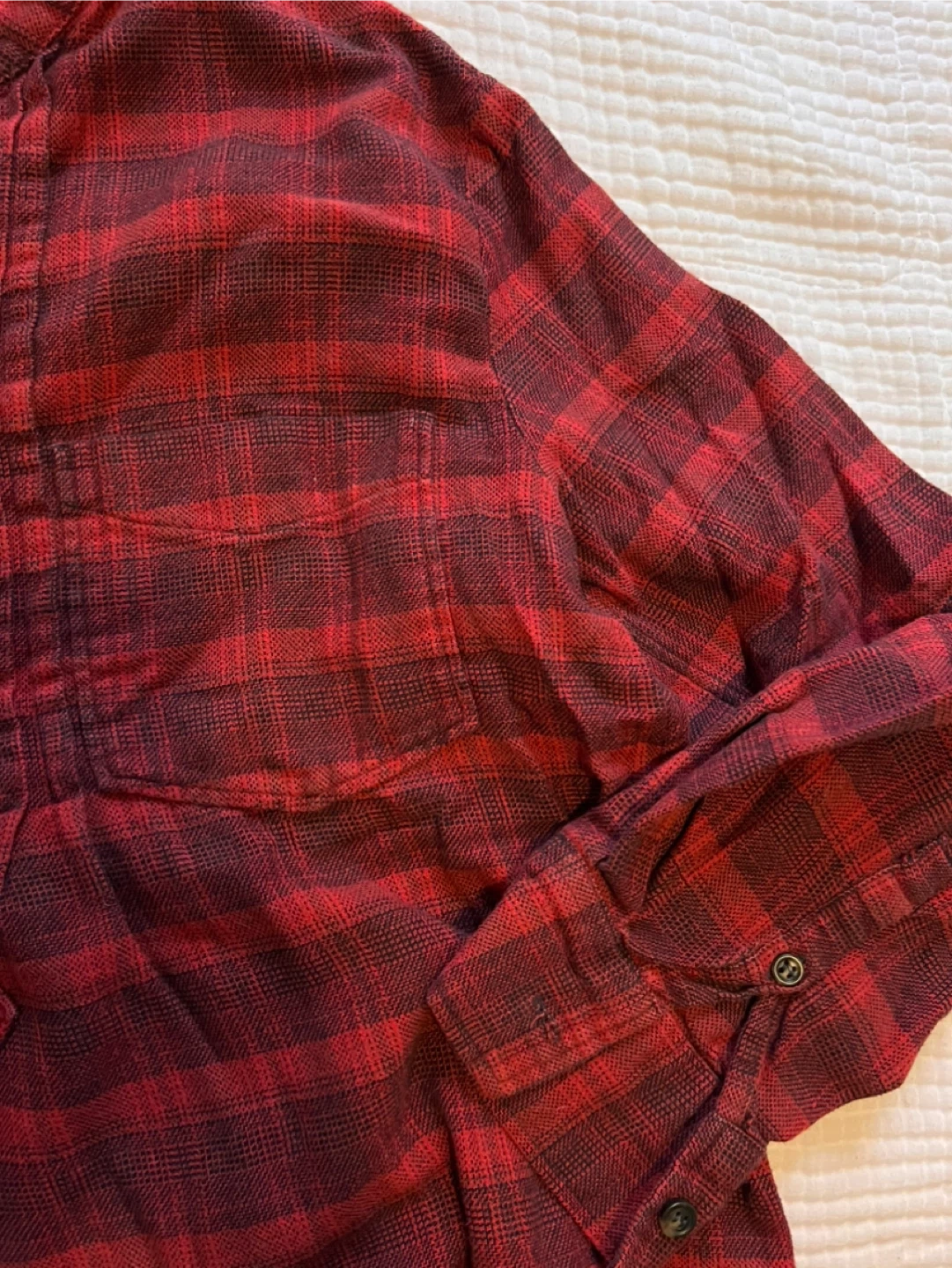 A cozy red plaid heavy weight shirt, perfect for layering or wearing on its own! It features a classic plaid pattern in shades of red and darker red. The shirt has a button-up front and long sleeves with buttoned cuffs. A comfortable and stylish addition to any wardrobe. No brand tag but great quality!