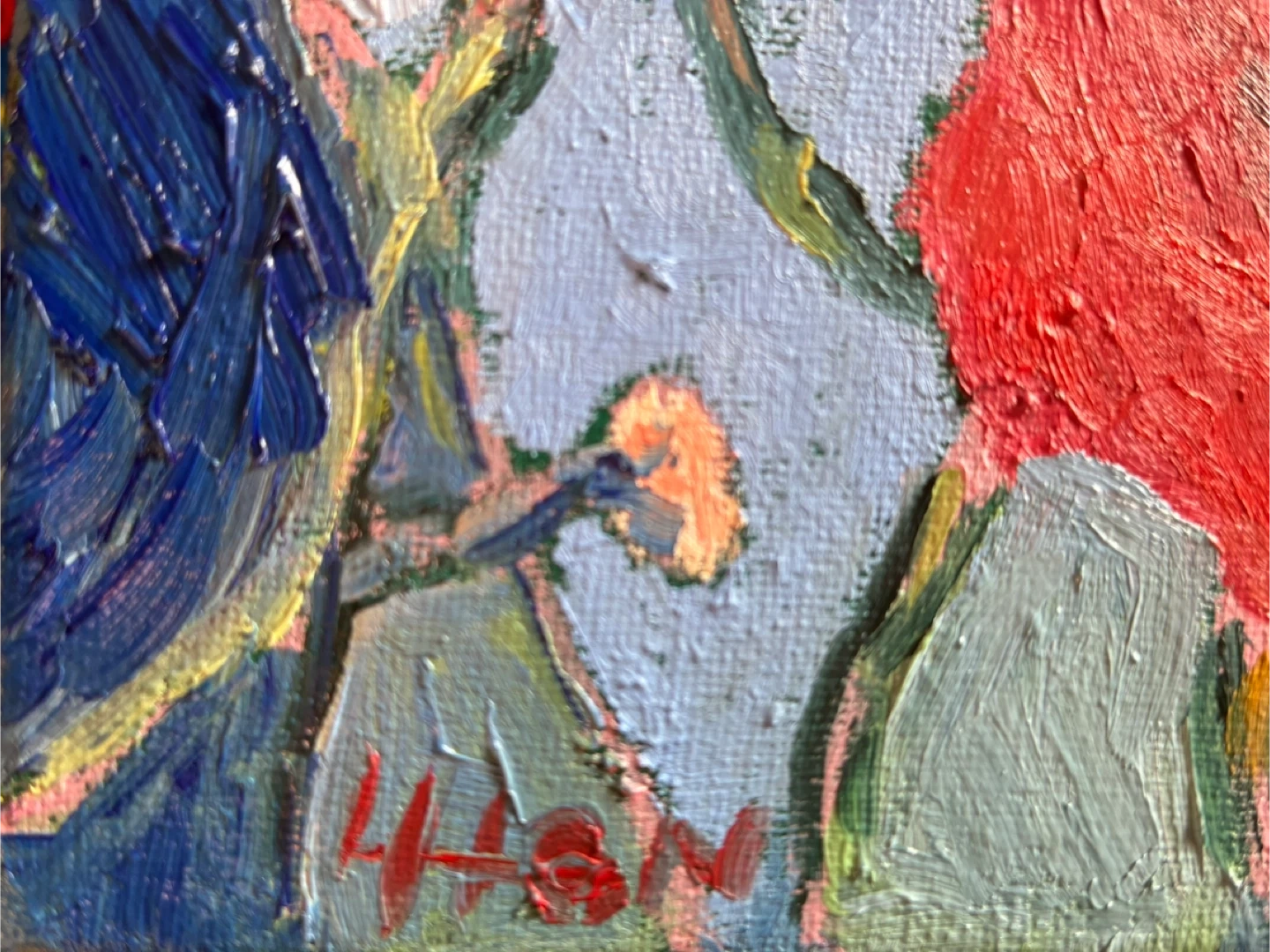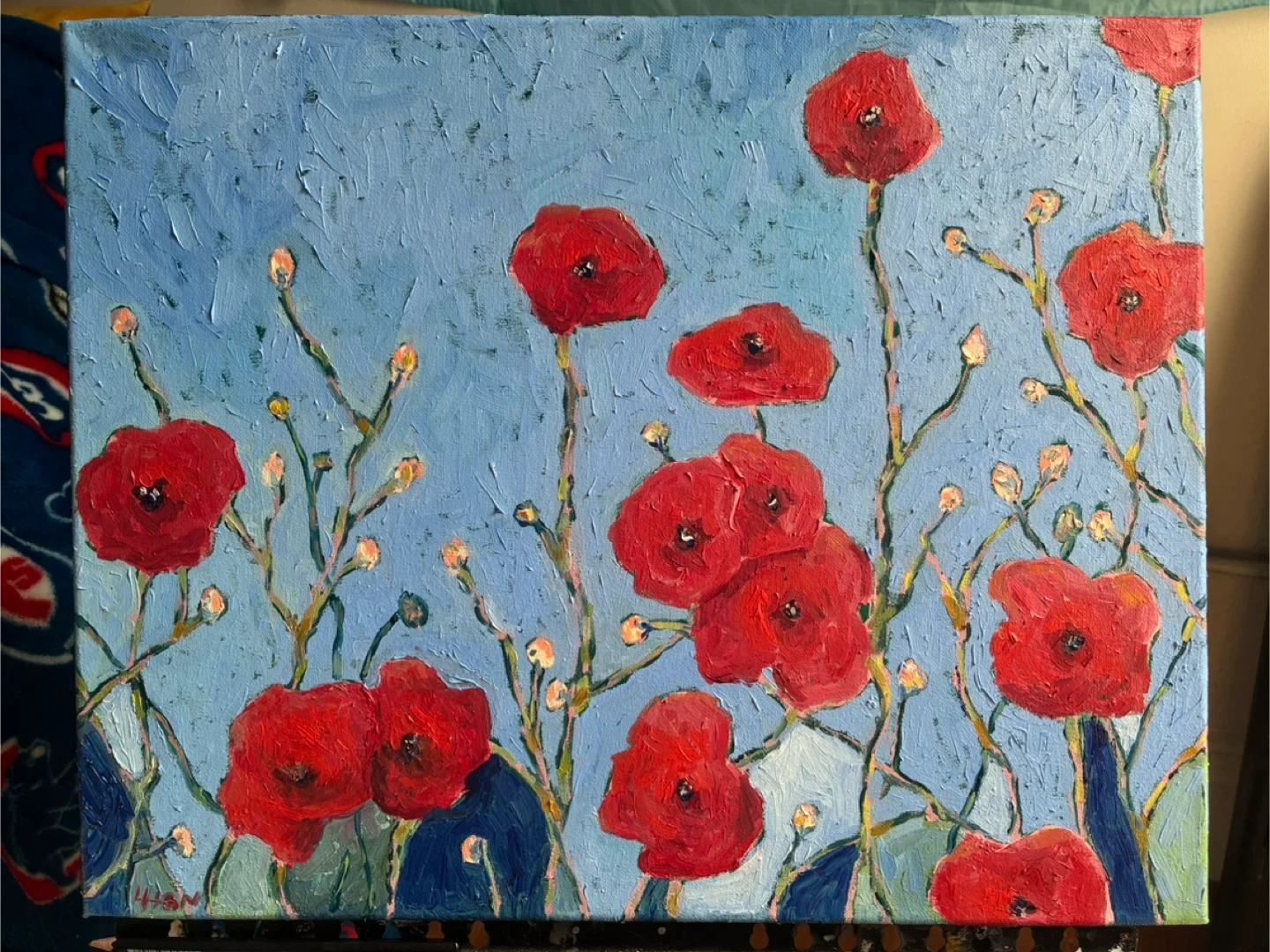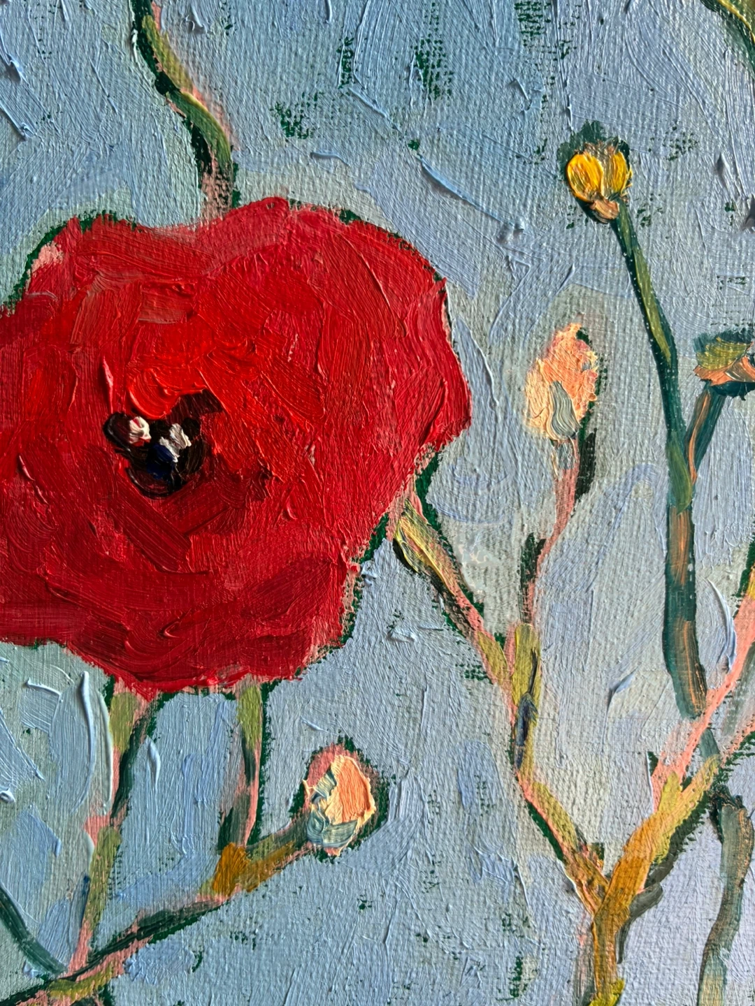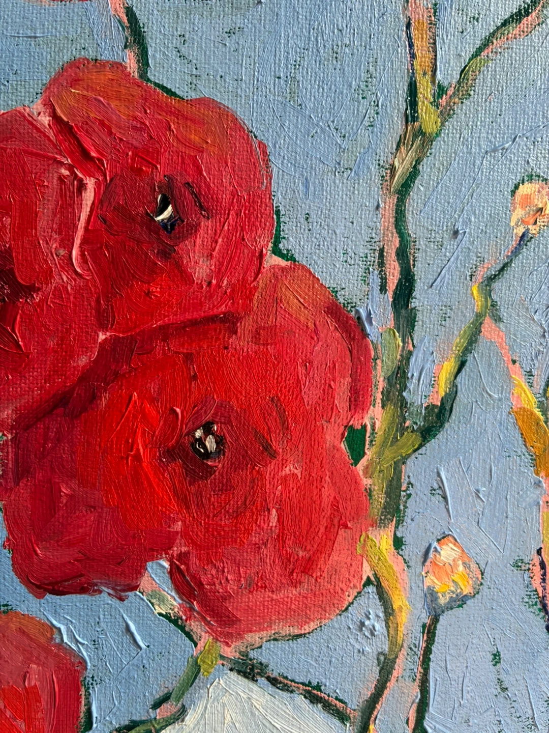 Original oil painting of red poppies on canvas. The painting features vibrant red flowers against a light blue background. It would make a lovely addition to any room!