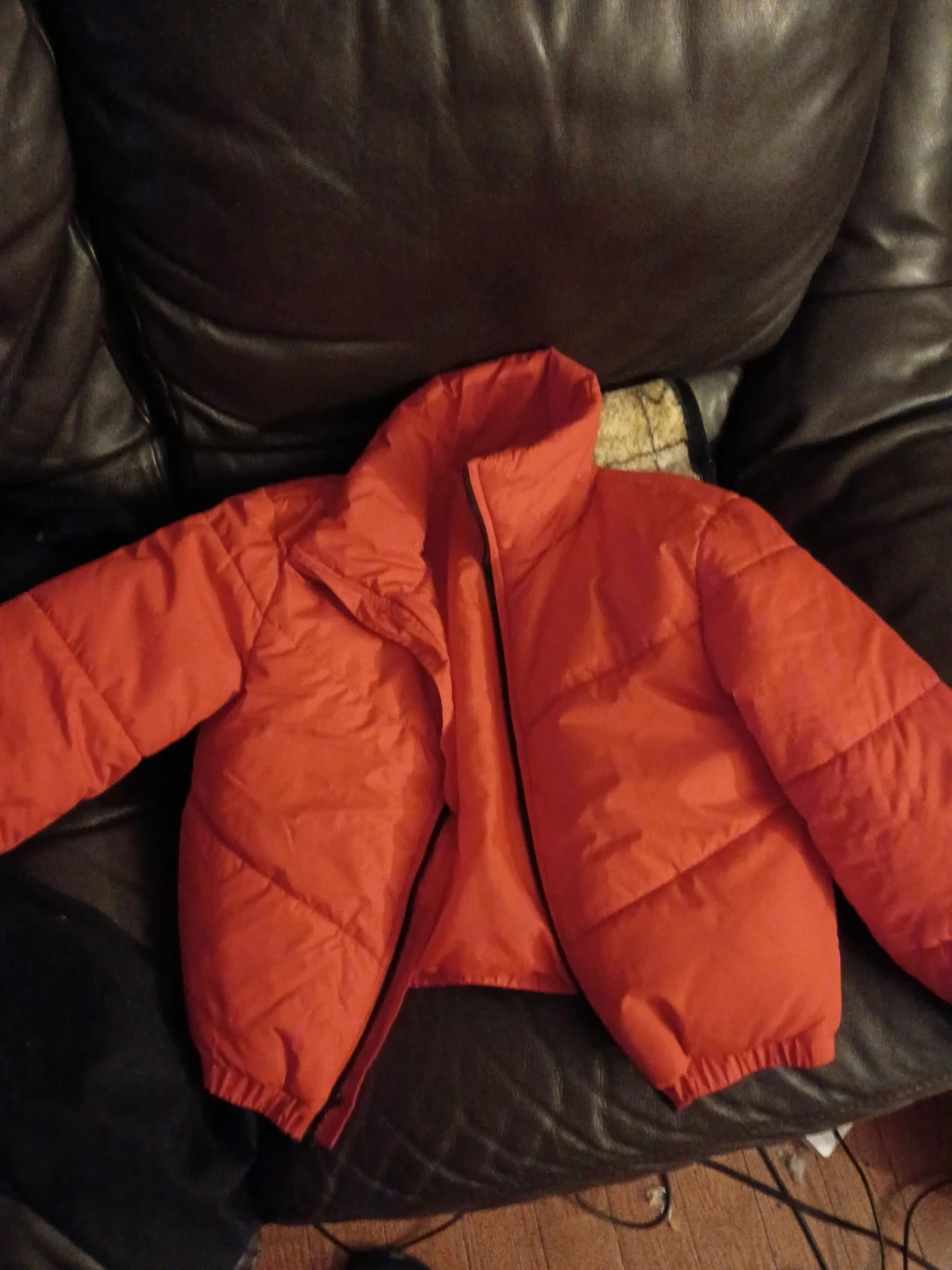 92Here's a red puffer jacket. It's in good condition and ready to keep you warm! The jacket features a quilted design and a high collar for extra protection against the cold