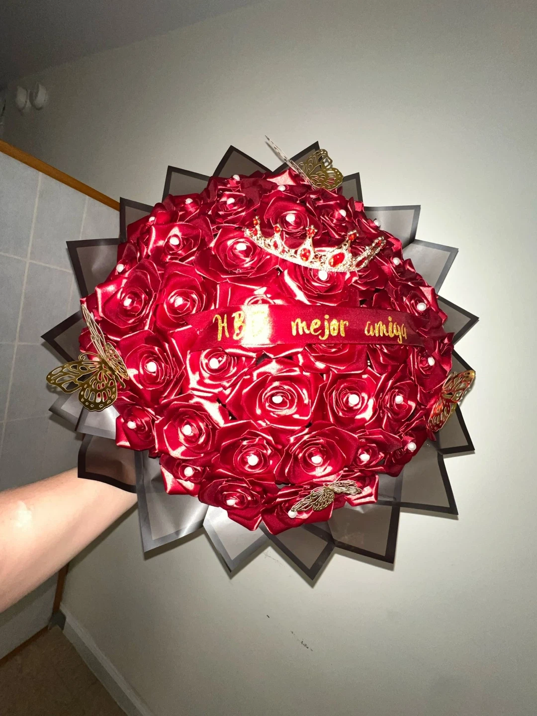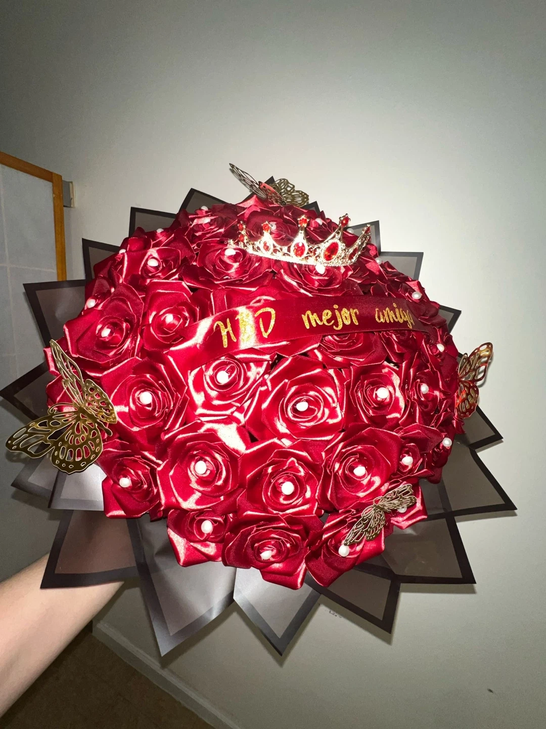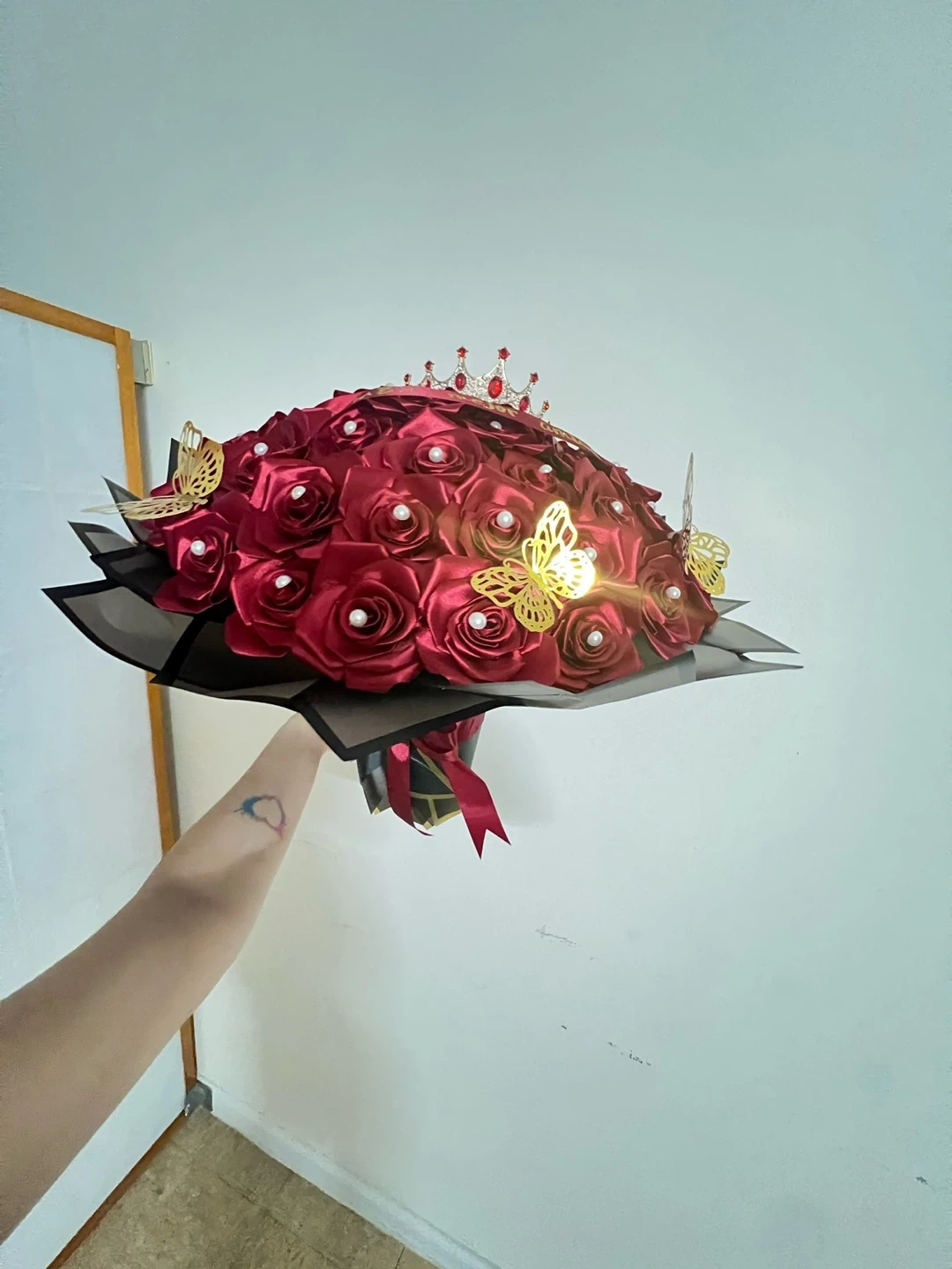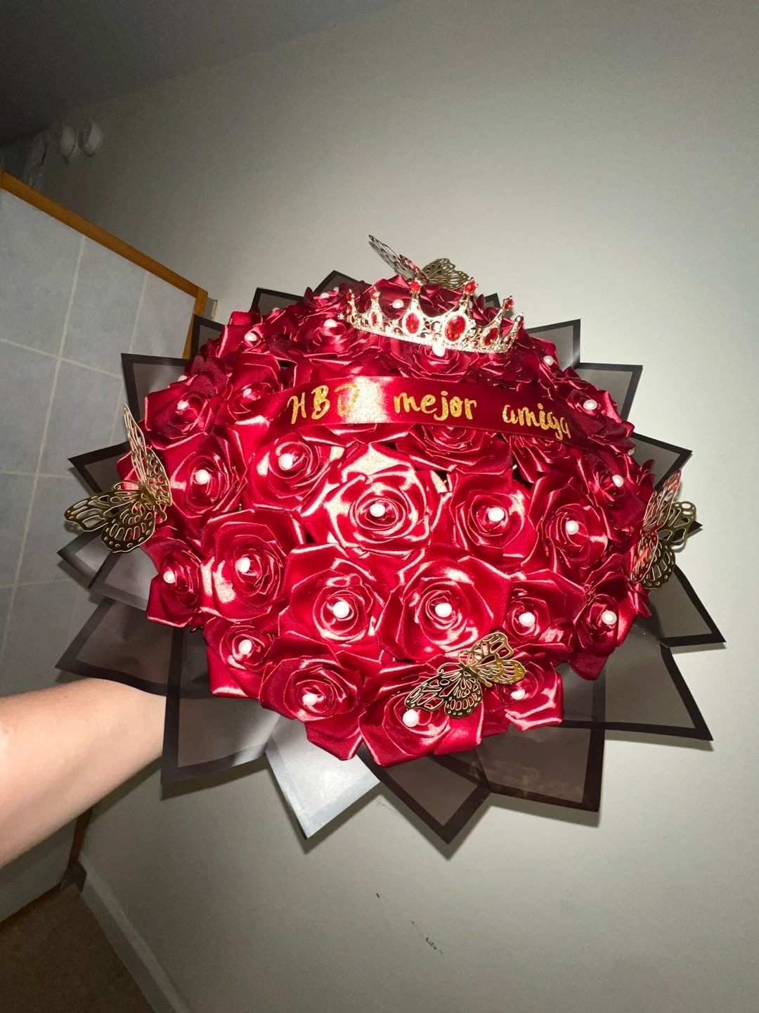 Beautiful red rose bouquet, perfect for a special occasion! It features a decorative crown and butterfly accents. The bouquet is in great condition and ready to brighten someone's day