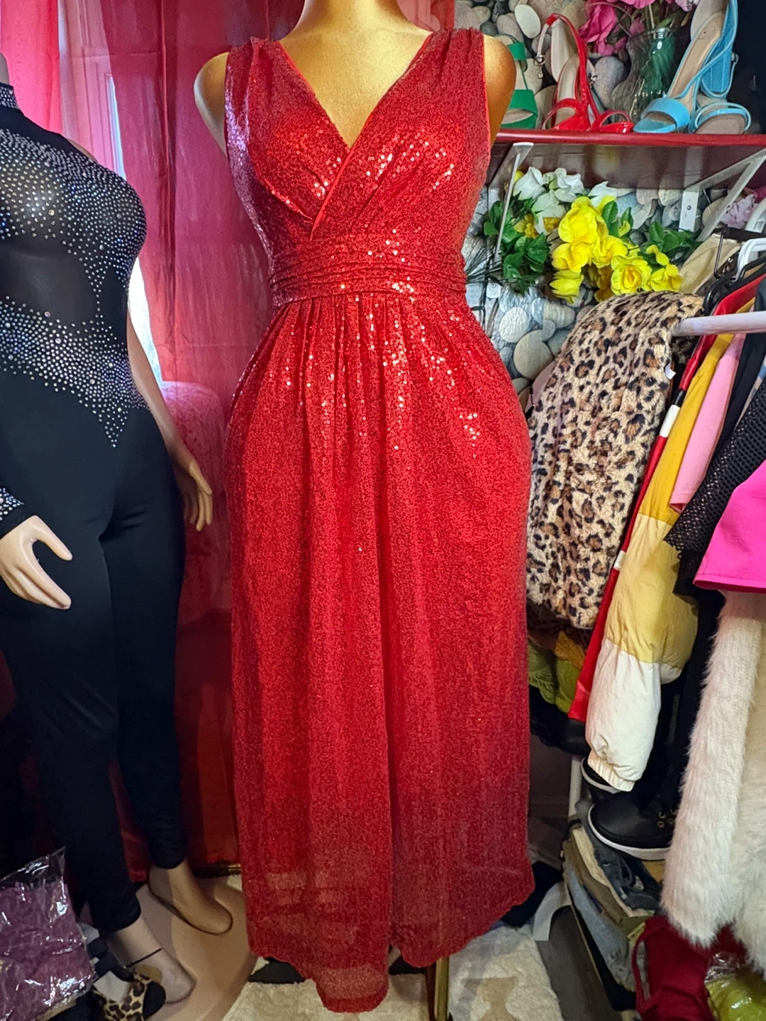 153Beautiful red sequin dress with a flattering V-neck design. Perfect for a special occasion or a night out! The dress has a comfortable fit and eye-catching sparkle.