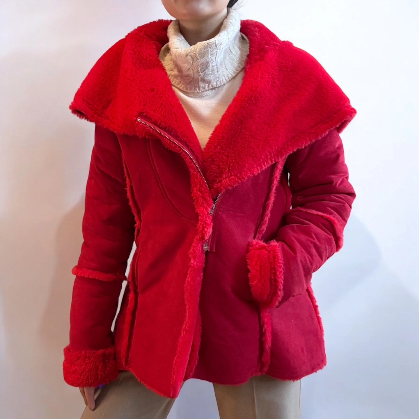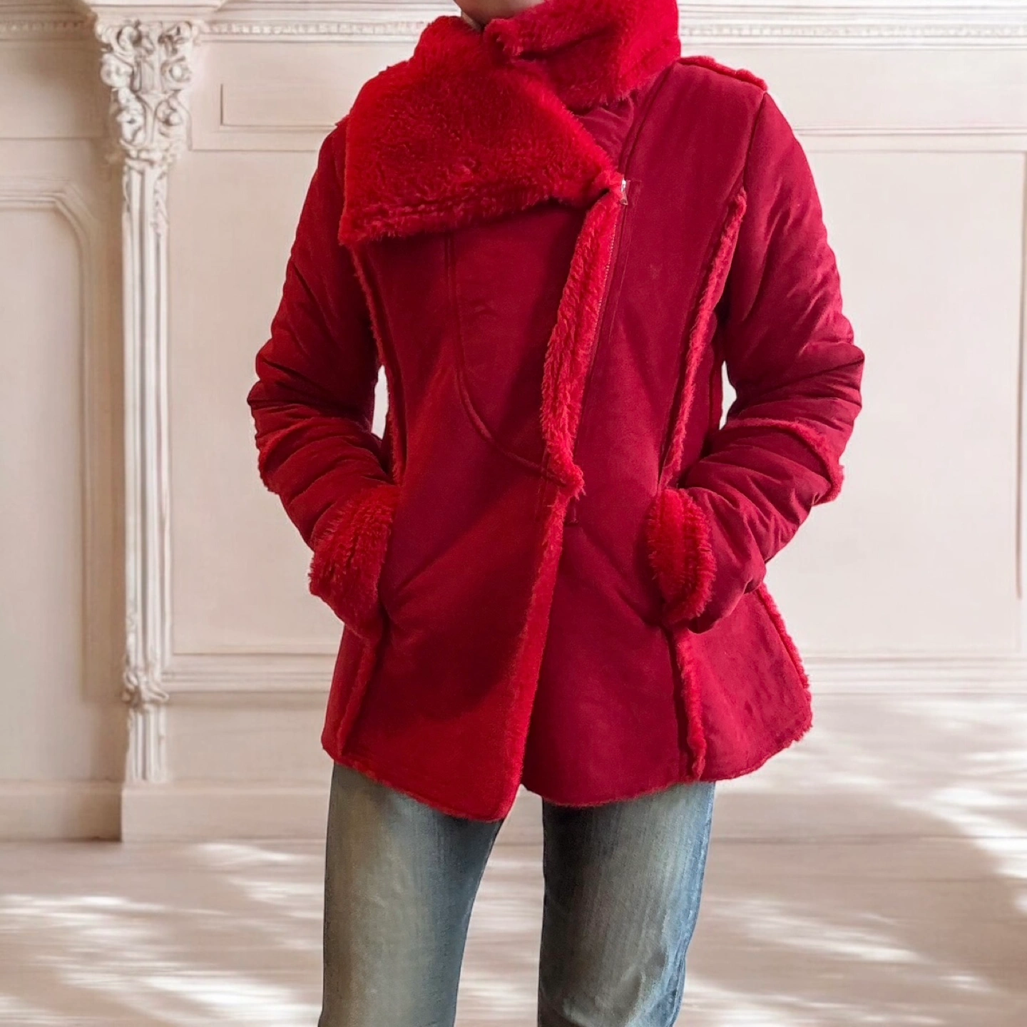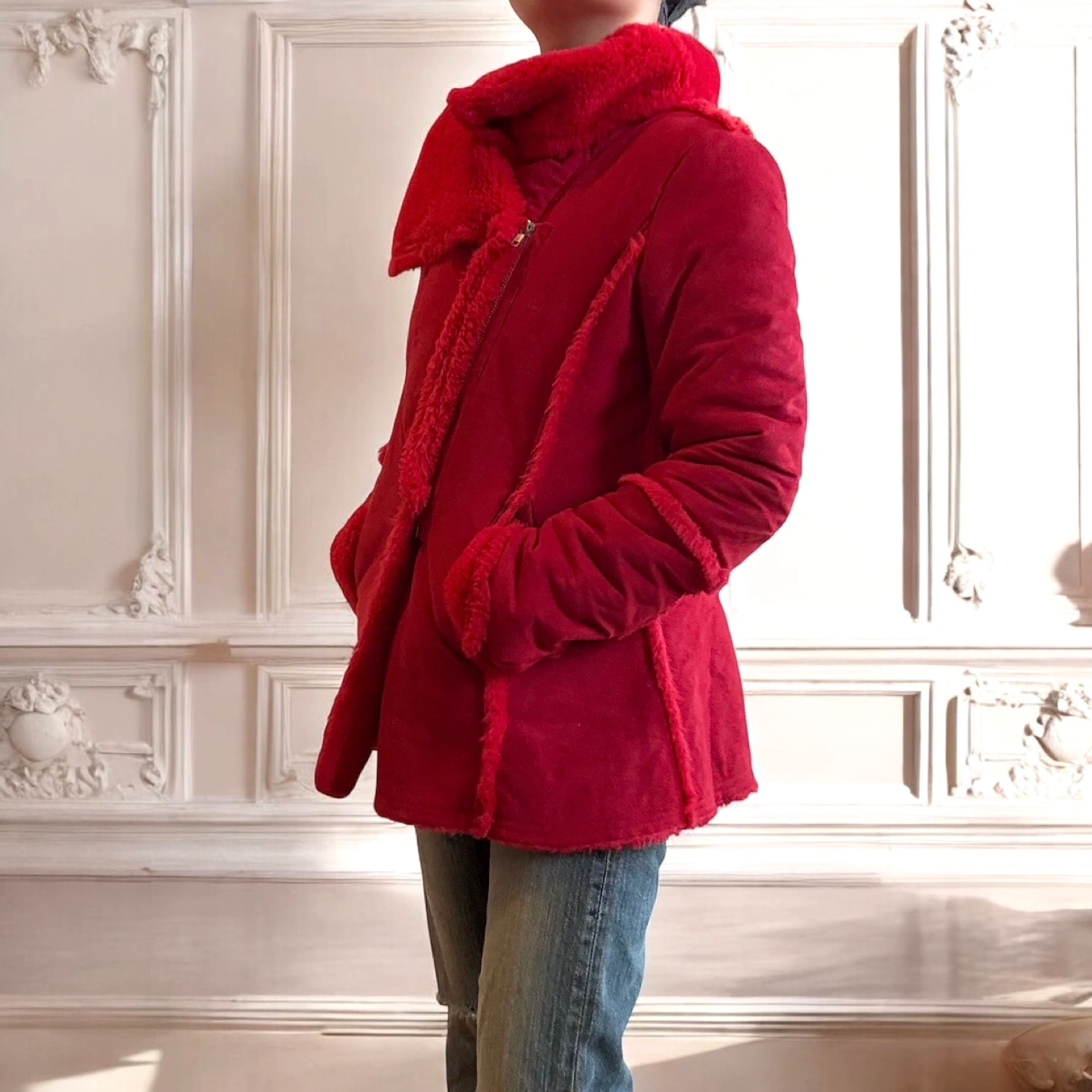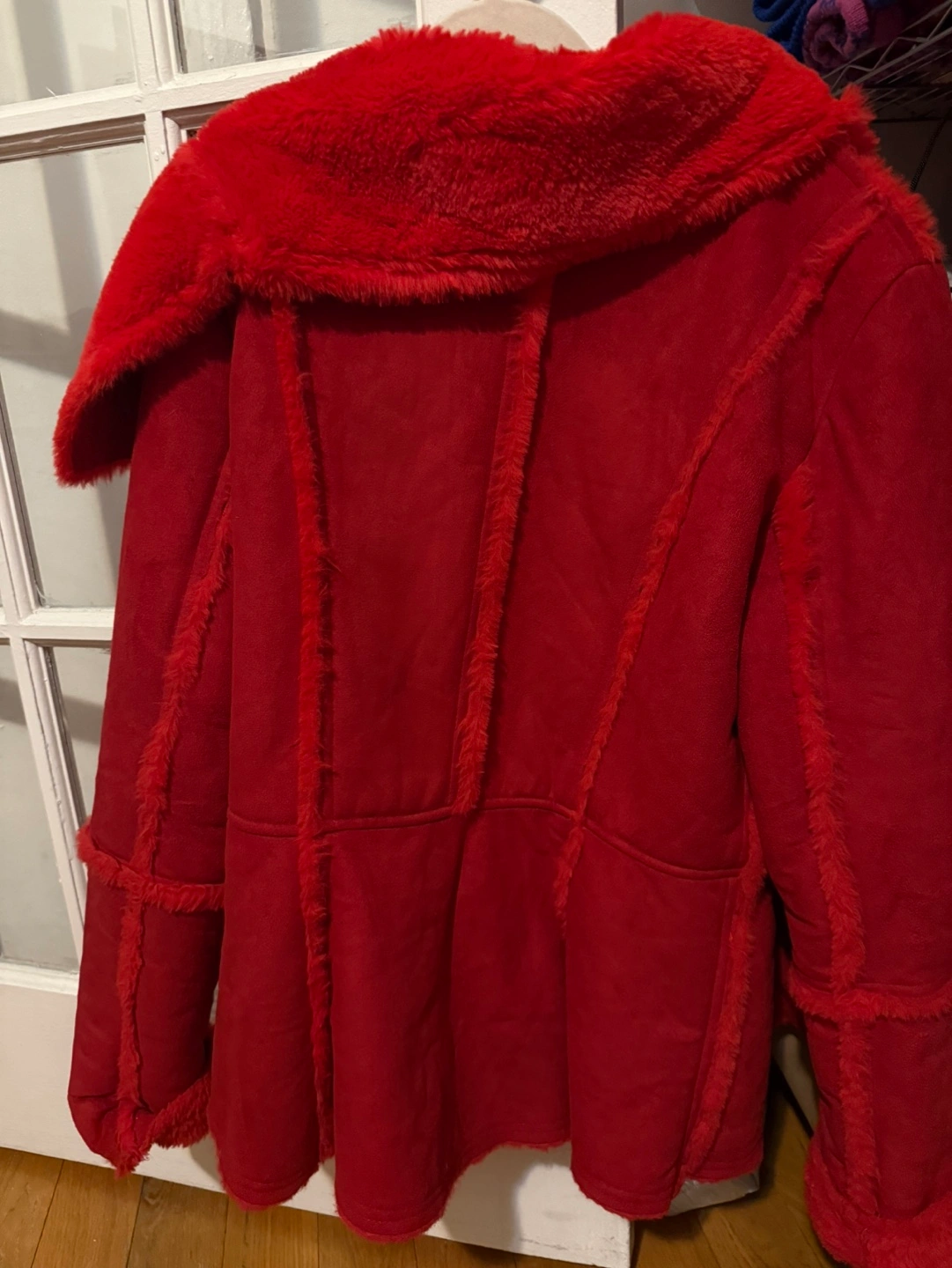 44Gorgeous red faux shearling coat and is a high quality handmade coat from Paris. Super lightweight and comfortable unlike real shearling leather coats. Brightens any outfit and complexion up for a dreary winter day. Would make an incredible going out coat as well. Can be styled with the collar up or down and has a super flattering cut at the waist. ✷ very good vintage condition ✷ fits XS-S ✷ shoulder: 17” ✷ pit: 18” ✷ waist: 17” ✷ length: 27” We’re on a mission to elevate and bring magic to pre-loved. Join us on instagram for giveaways, exclusive sales, and behind the scenes content @kkachi.shop 🖤 #shearlingcoat #shearlingjacket #furcoat #furjacket #redcoat red jacket saks Potts charlotte simone I am gia susanna chow jacquemus isabel marant acne studios maje ganni iro apparis ugg