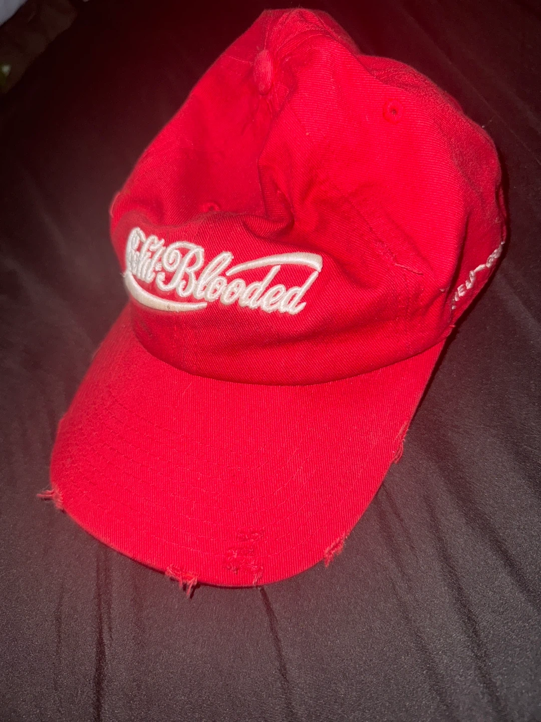 Selling a red 'Still Blooded' hat. It has some signs of wear on the brim, as pictured