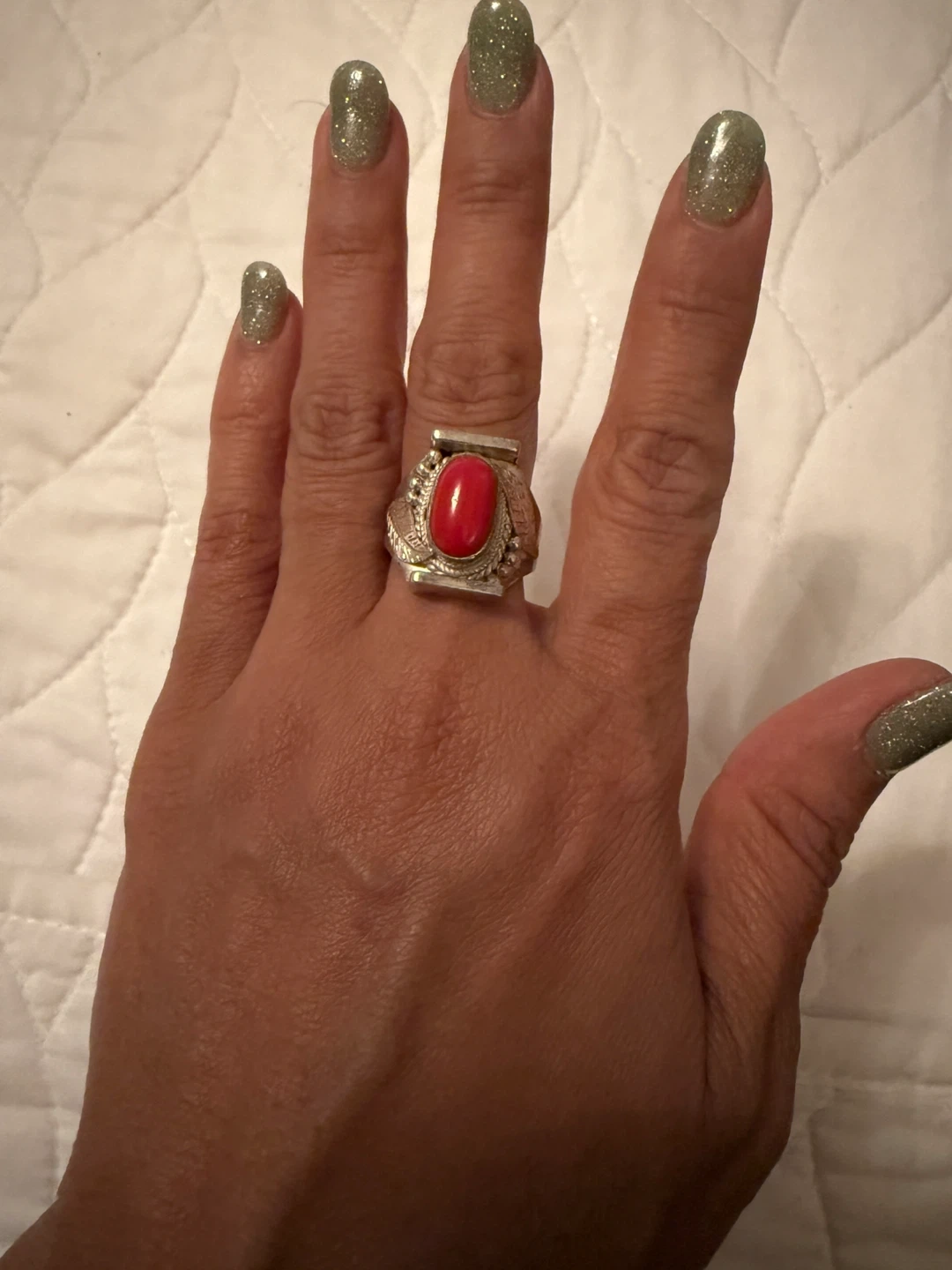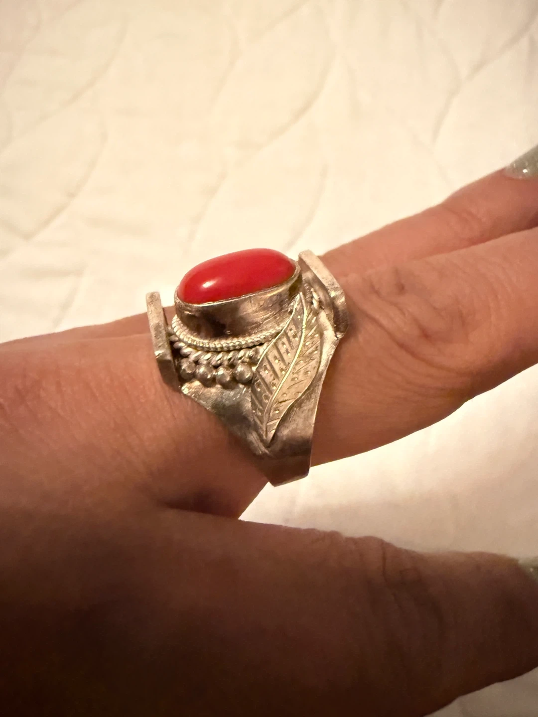 This is a beautiful silver ring with a red stone. It has a unique design with detailed silver work around the stone and on the band. It's in great condition and ready to add a pop of color to your jewelry collection