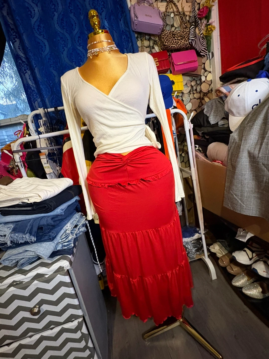 Selling a vibrant red tiered midi skirt! It's in great condition and ready to add a pop of color to your wardrobe. Perfect for a casual day out or dressed up for an evening look
