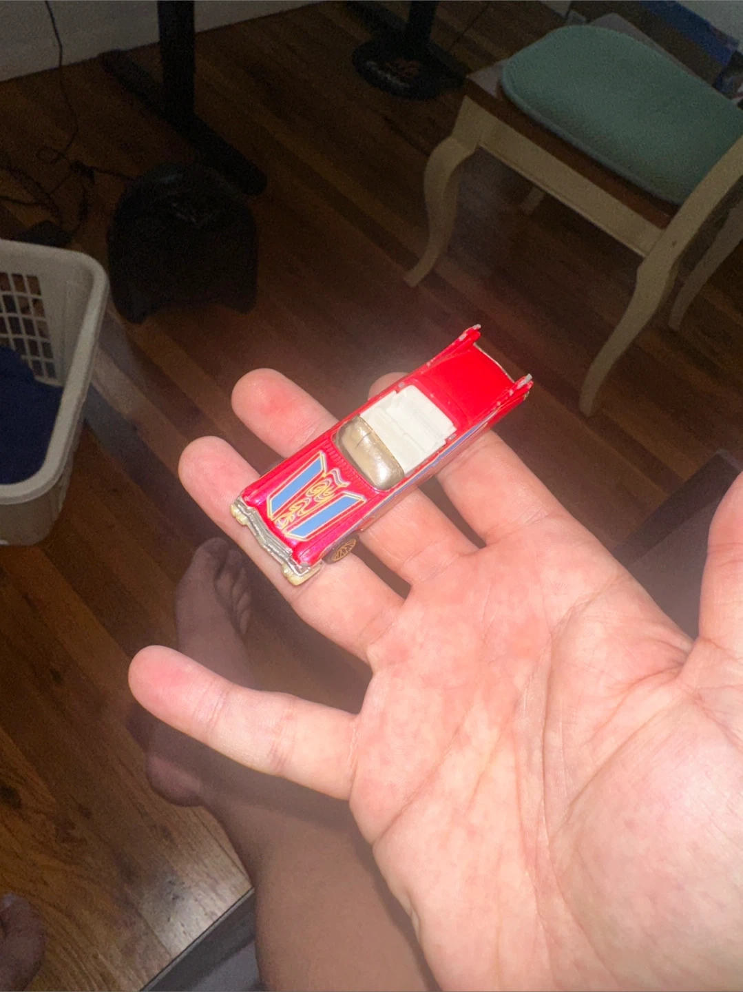 Selling a red toy car. It has some wear and tear, but it's still fun to play with