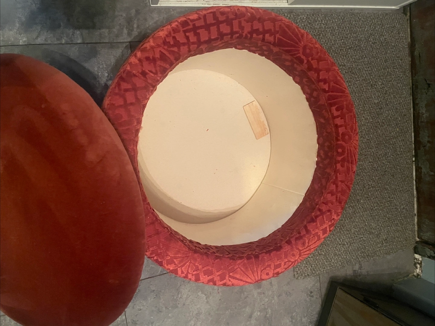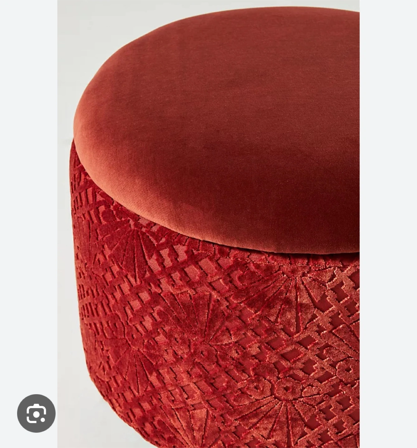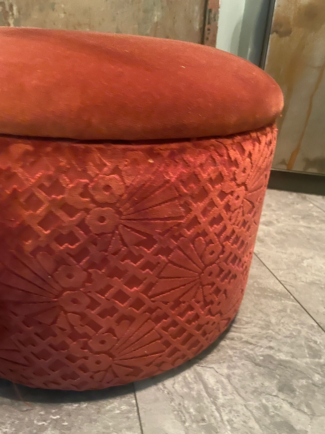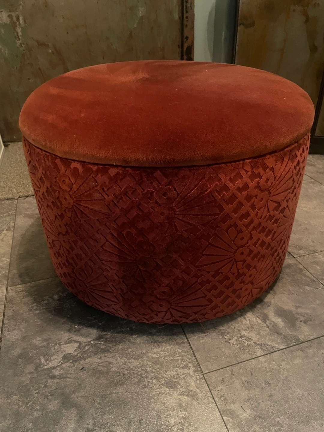 5A red velvet circular storage ottoman. Upholstered with burn out red velvet on the side and features a removable lid. Minor marks on top but overall in good condition. Perfect for relaxing with a cup of tea and a good book! Originally purchased from anthropologie for over $300