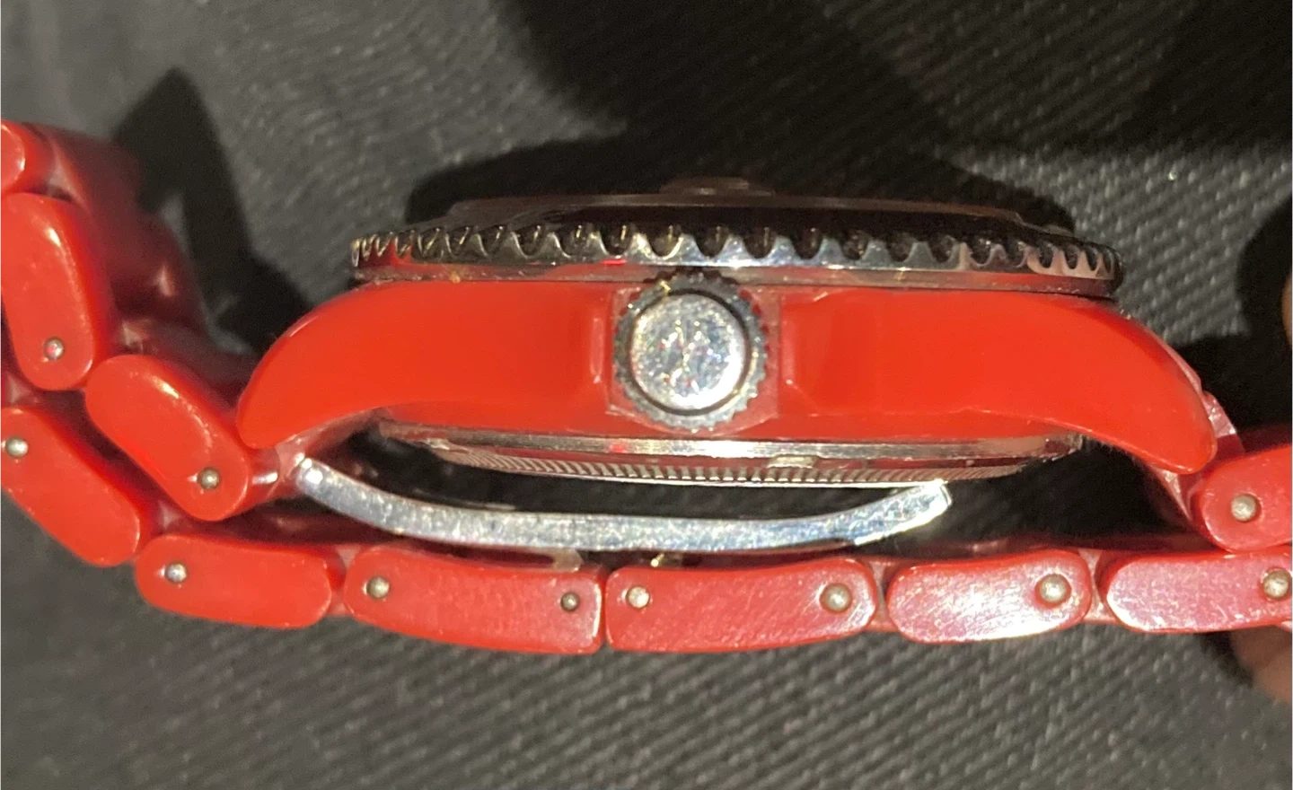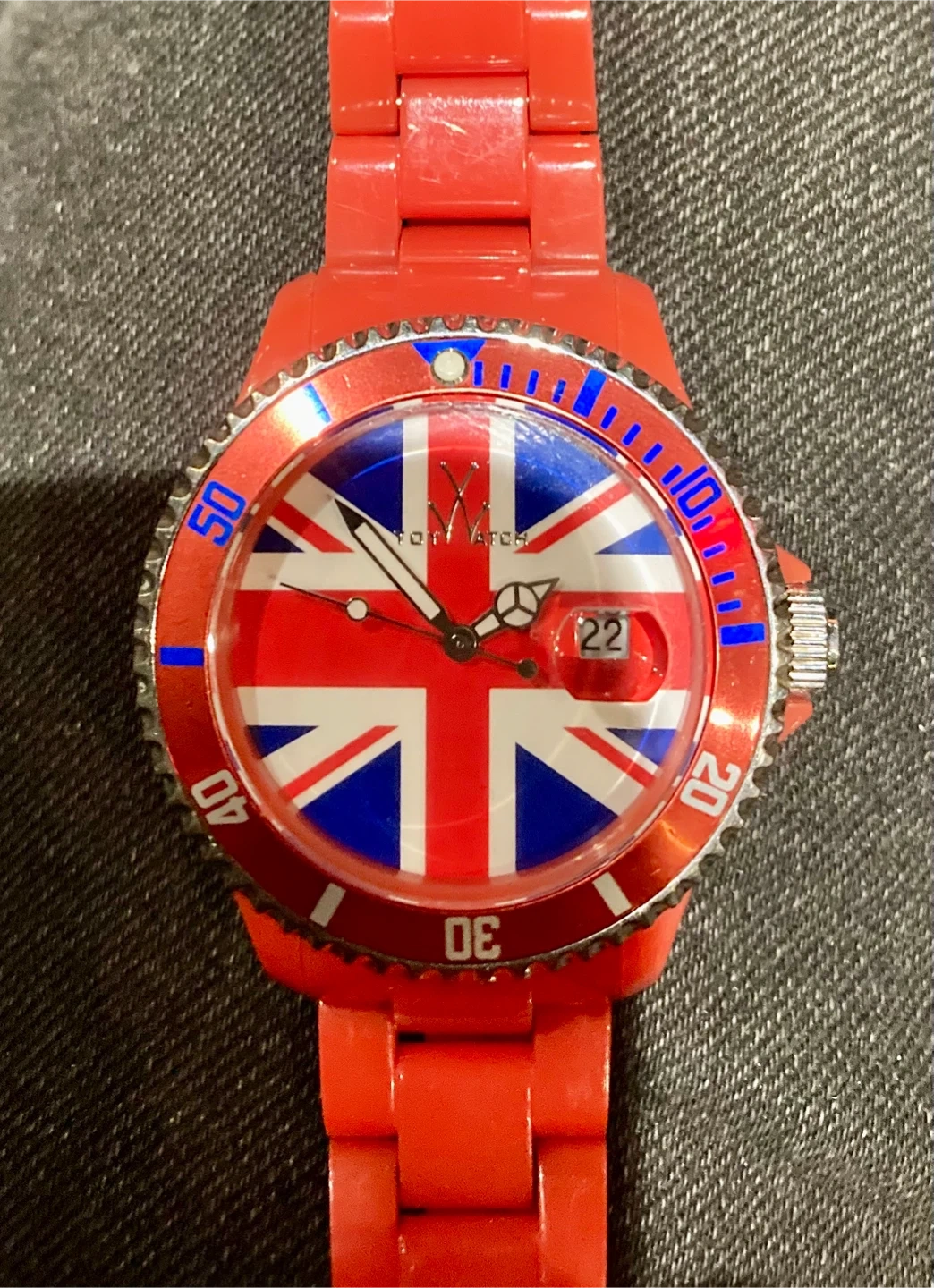 Selling a fun watch in red! It features a Union Jack design on the face and a date display. Hands glow green, and numbered ring moves for time intervals. The back is stainless steel. Bracelet is double lock and adjustable to fit. Not heavy weight on the wrist. It's in good condition and has new battery.