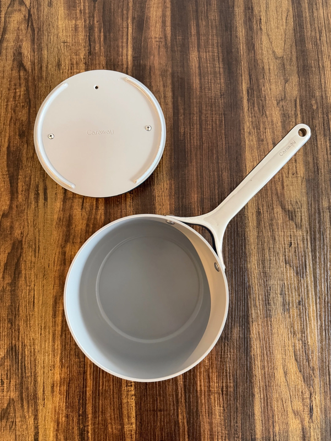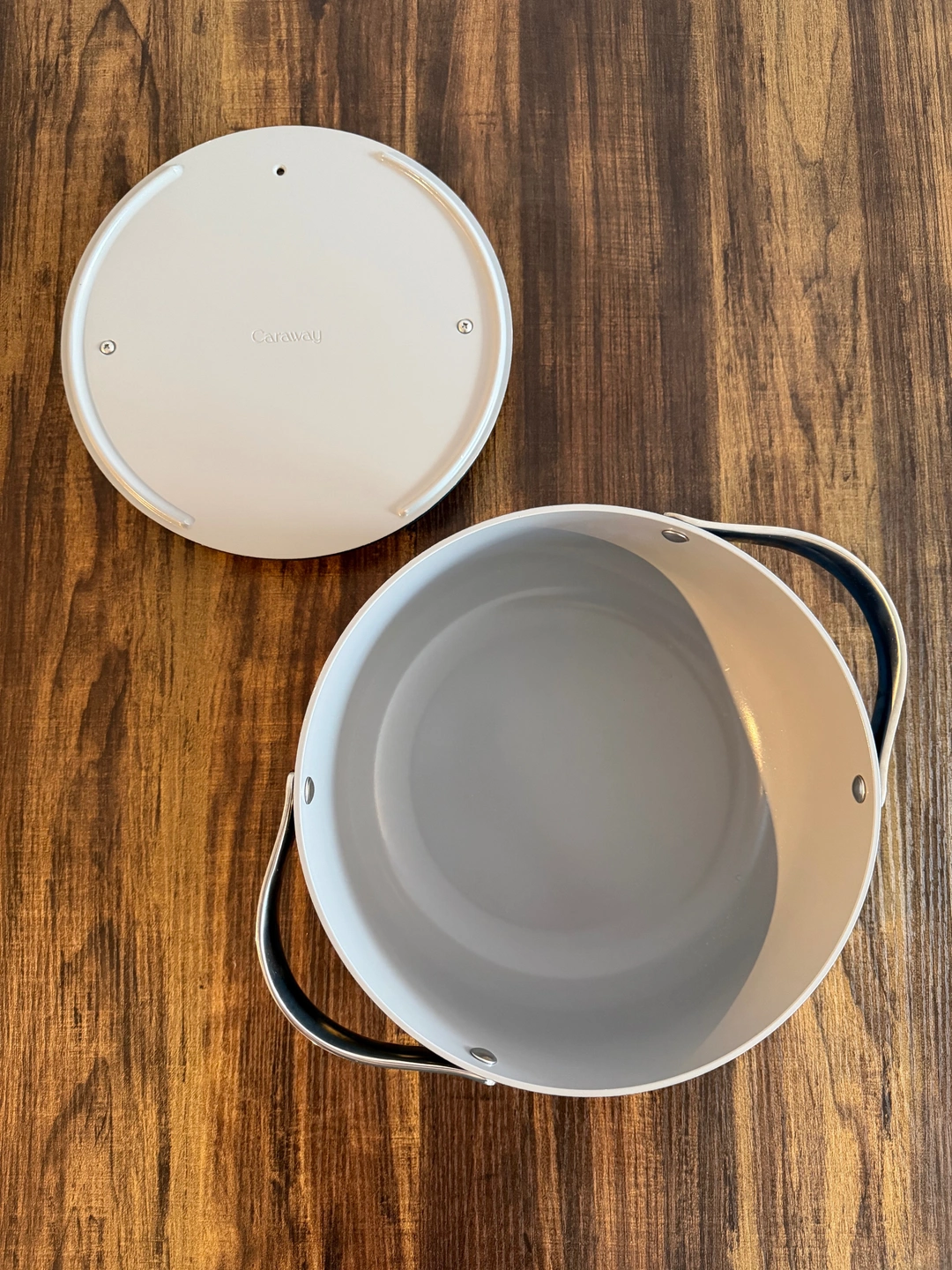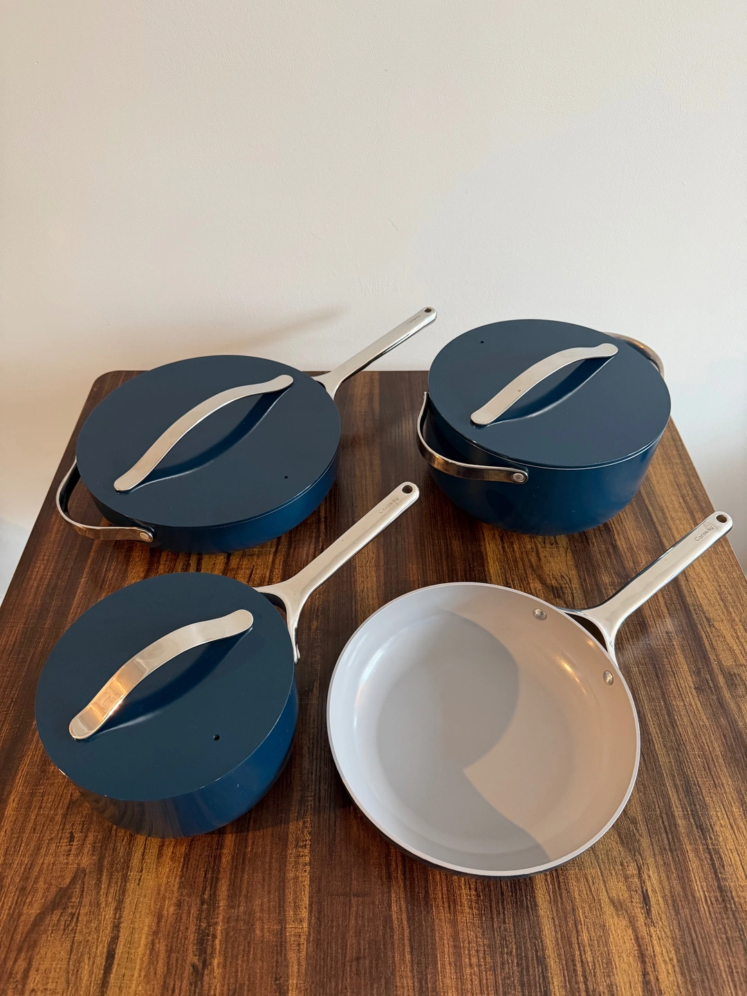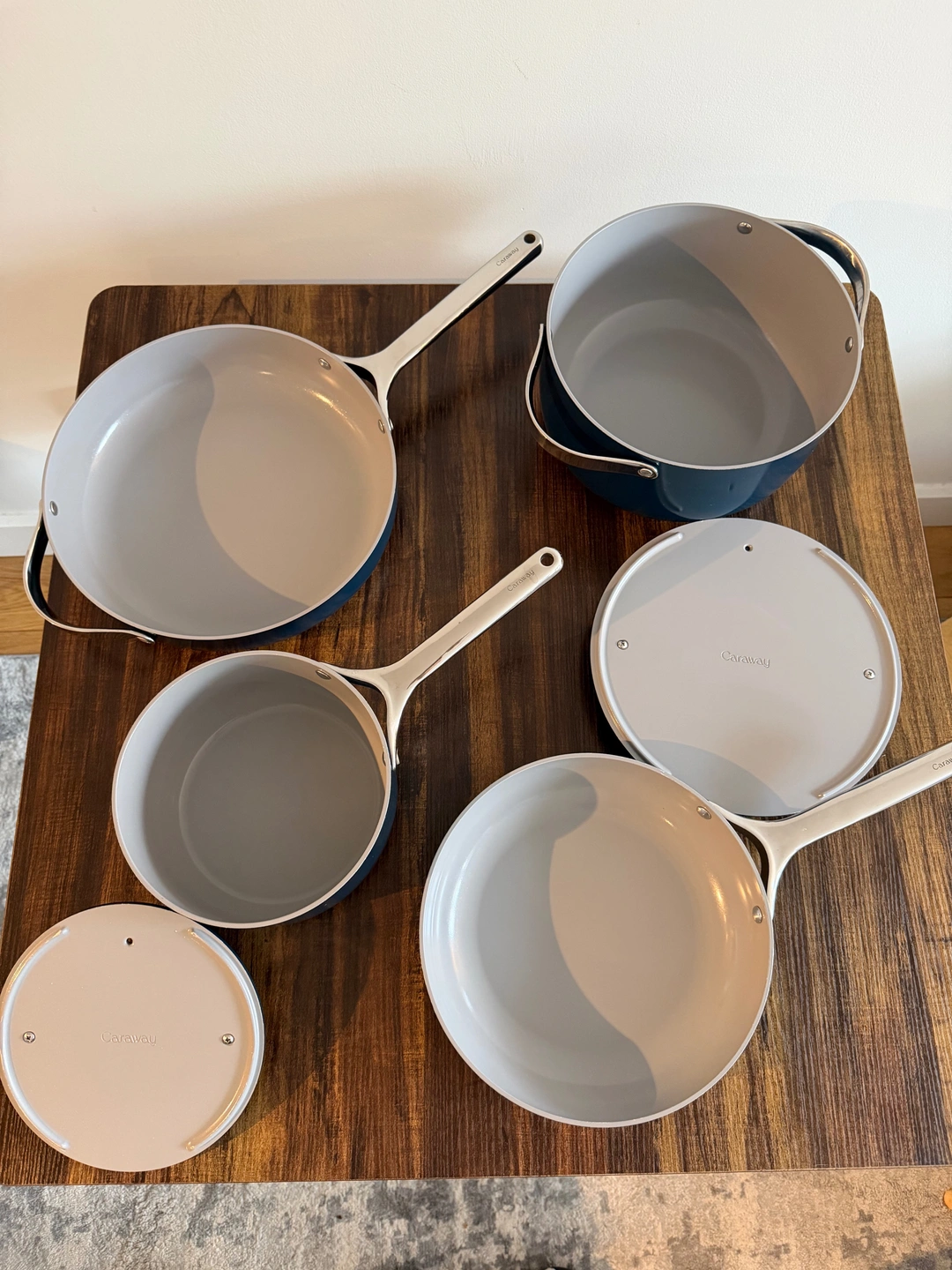Selling a Caraway 12-piece ceramic cookware set in great condition. This is a premium cookware brand known for its non-toxic ceramic coating and modern design.