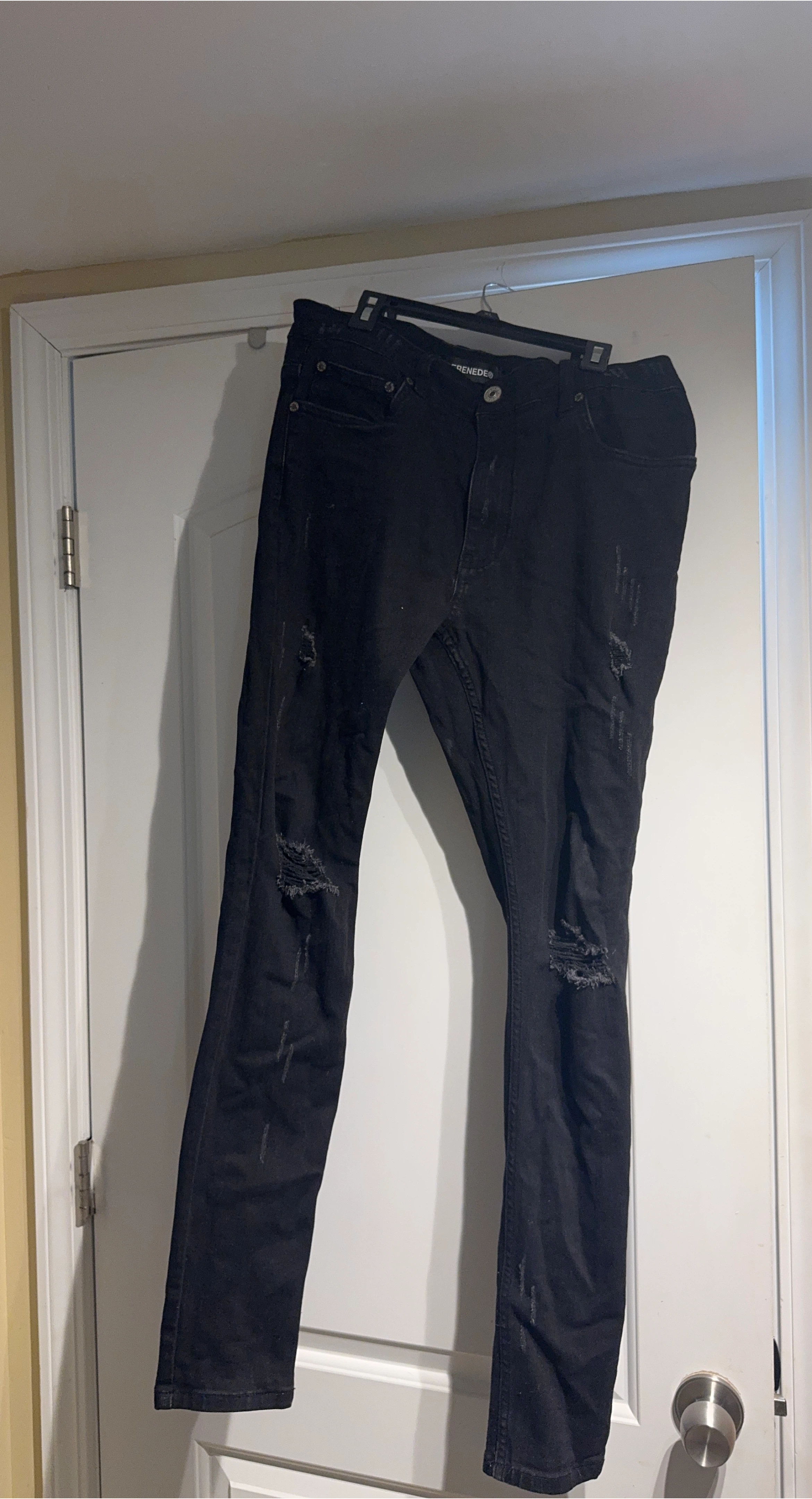 15Selling a pair of black distressed jeans from the brand REDE. They're in good condition and have a stylish, worn look with the distressed details