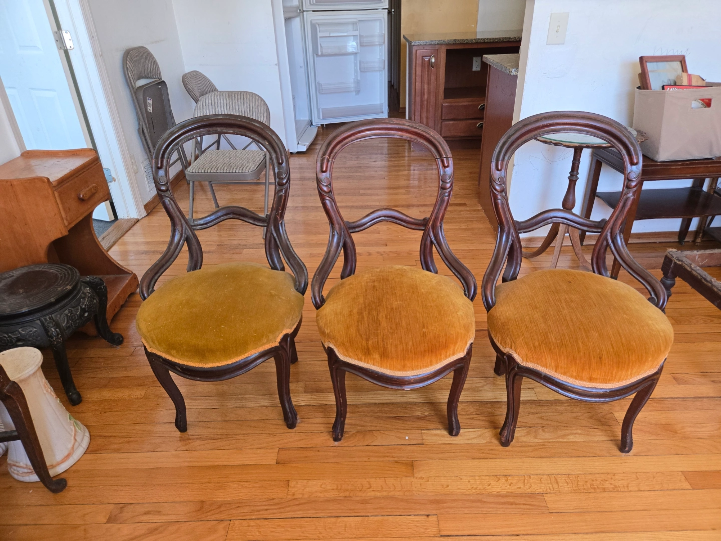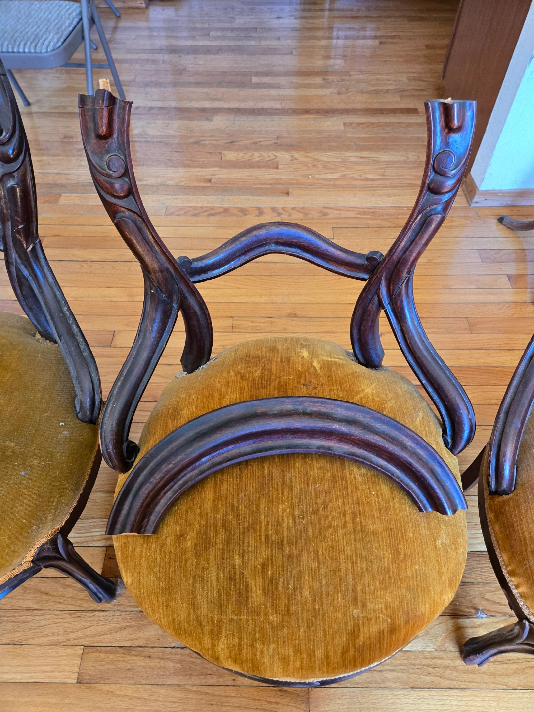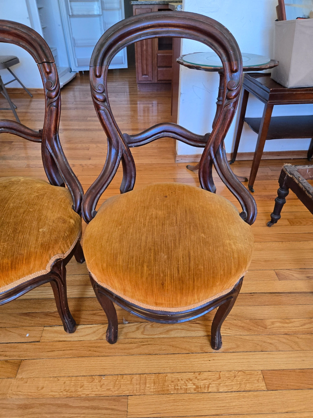 **REDUCED** 3 Baloon back Victorian Chairs. Sturdy, one wood back separates at top, can be fixed. Three antique chairs, dark wood, mustard yellow velvet seats. Some wear and tear. Ornate carvings on the back. Perfect for a vintage or eclectic home.