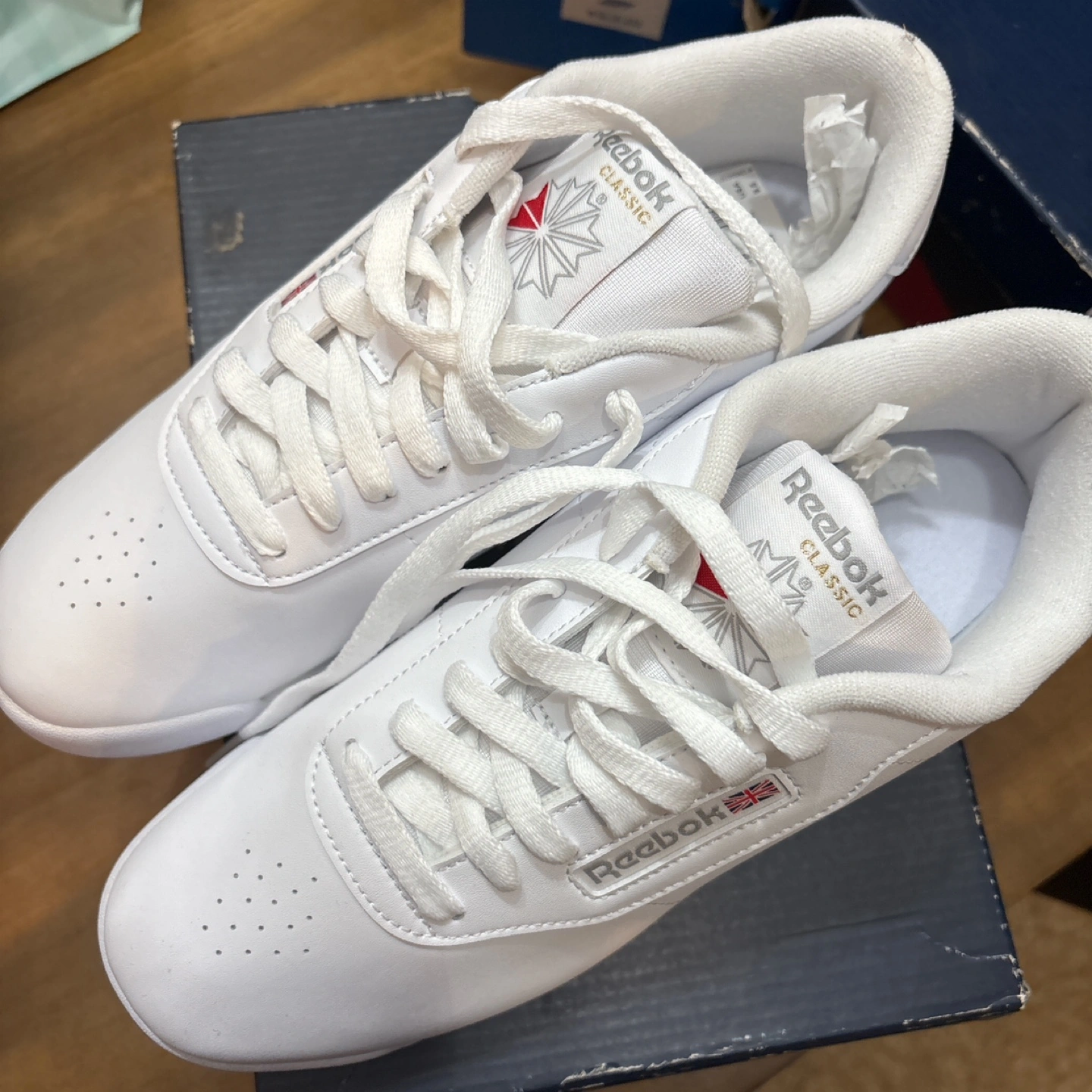 60Selling a pair of Reebok Classic sneakers in white. They're in great condition and ready for a new home! The classic design features the iconic Reebok logo and a comfortable fit.