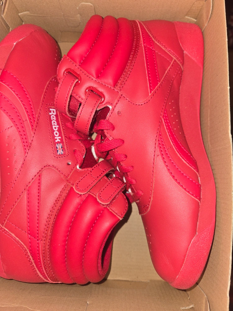 Selling a pair of red Reebok Freestyle Hi sneakers! These are in great condition and come in the original box.