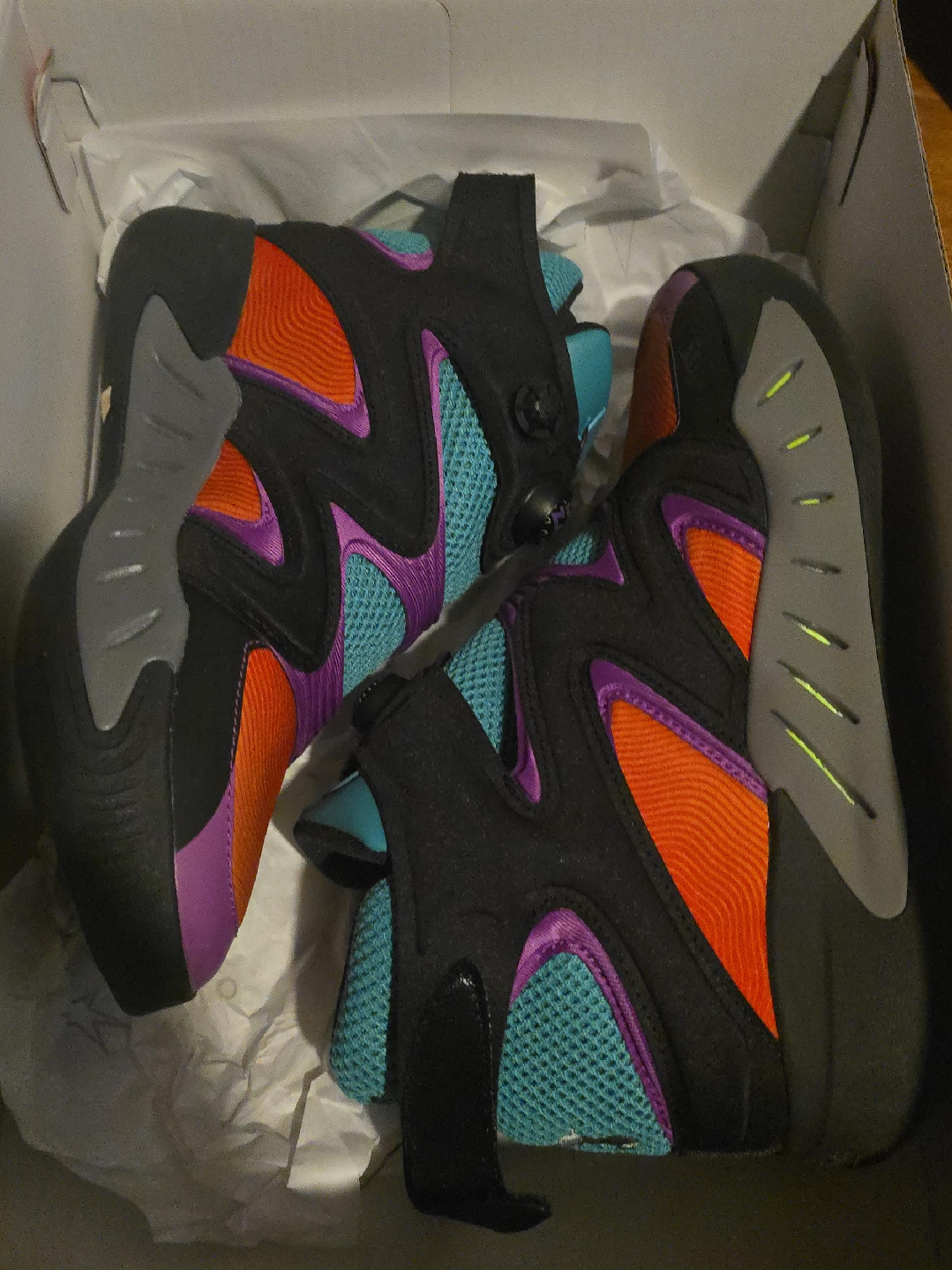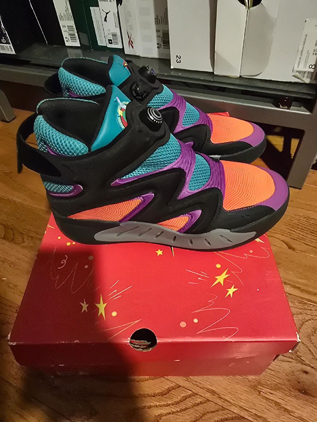 60Selling a pair of Reebok Instapump Fury Zone basketball shoes in US size 7! They come with the original box. These shoes feature a unique design with black, orange, purple, and teal accents. Perfect for basketball or casual wear!
