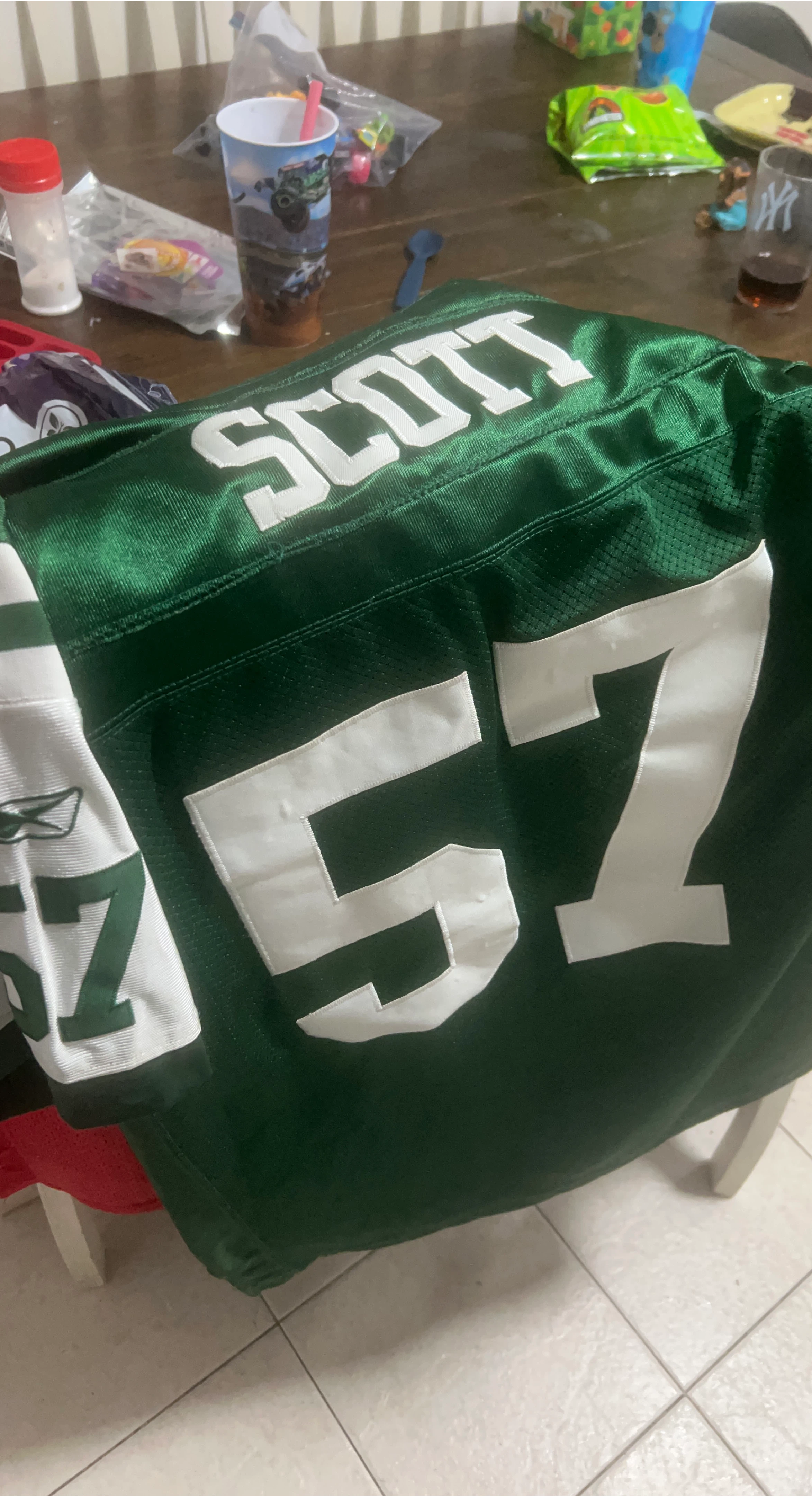 60Selling a Reebok New York Jets Bart Scott #57 jersey. It's green and white and in good condition!