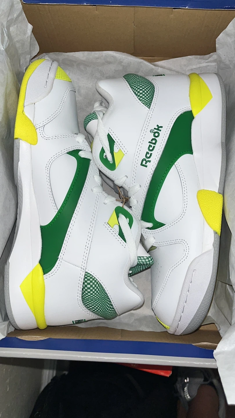 Here are some Reebok Pump Omni Zone II sneakers in a white and green colorway! These shoes are in great condition and come with the original box. They have a unique design with the classic Reebok pump technology. Perfect for anyone looking for a stylish and comfortable pair of sneakers!