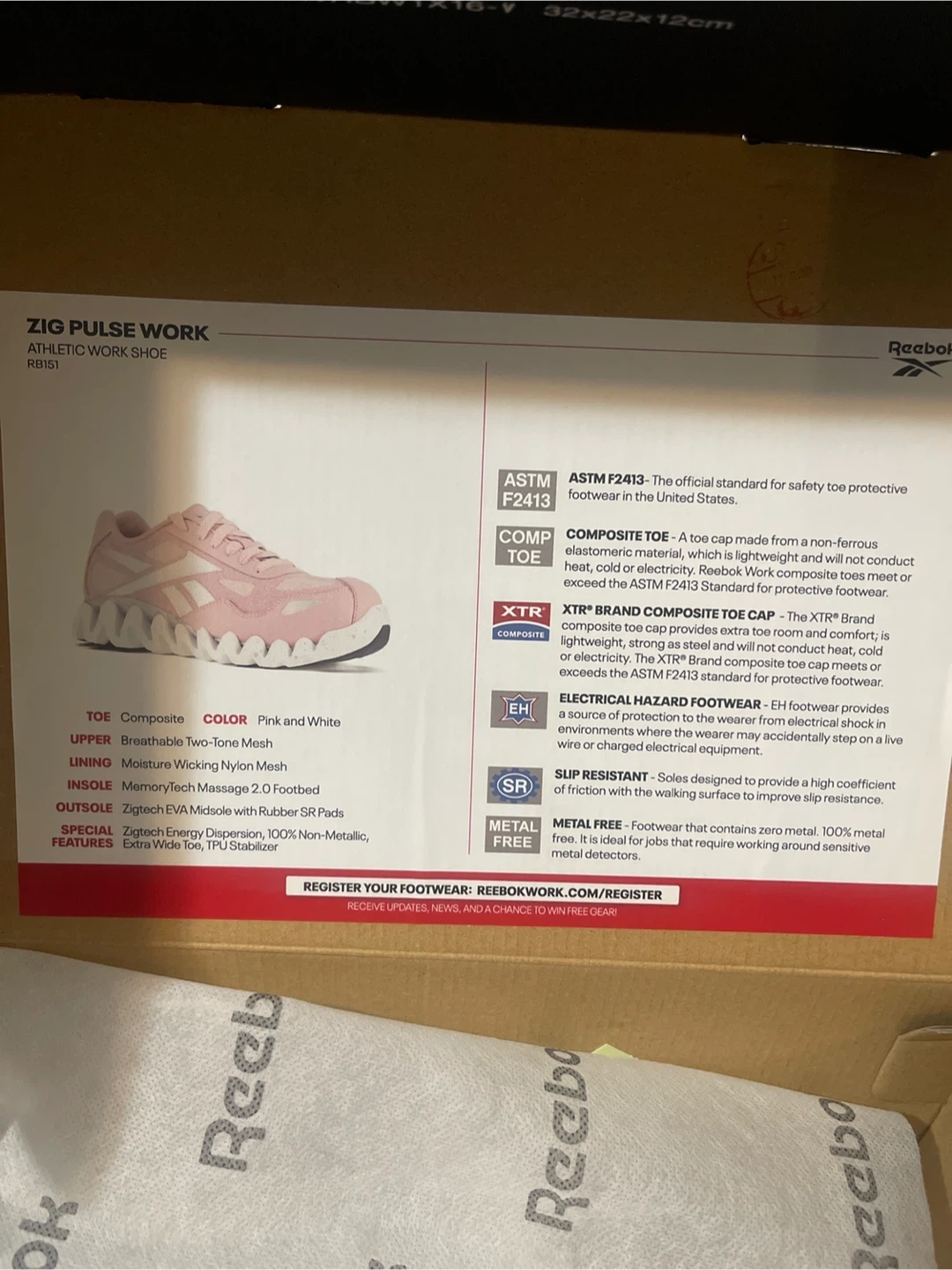 Selling a pair of Reebok Zig Pulse athletic work shoes in pink and white! These shoes feature: - Composite Toe - Breathable two-tone mesh upper - Moisture-wicking nylon mesh lining - MemoryTech massage 2.0 footbed - Zigtech EVA midsole with rubber SR pads - Extra wide toe and TPU stabilizer They are designed to provide high coefficient friction with the walking surface to improve slip resistance. The shoes are also metal-free!