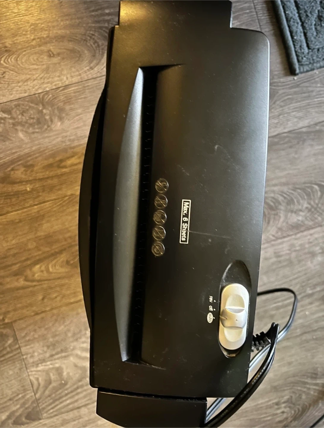 This is a WMC6SB paper shredder. It shreds a maximum of 6 sheets at a time. Continuous shredding is 2 minutes on and 4 minutes off. It's great for keeping your personal documents secure!