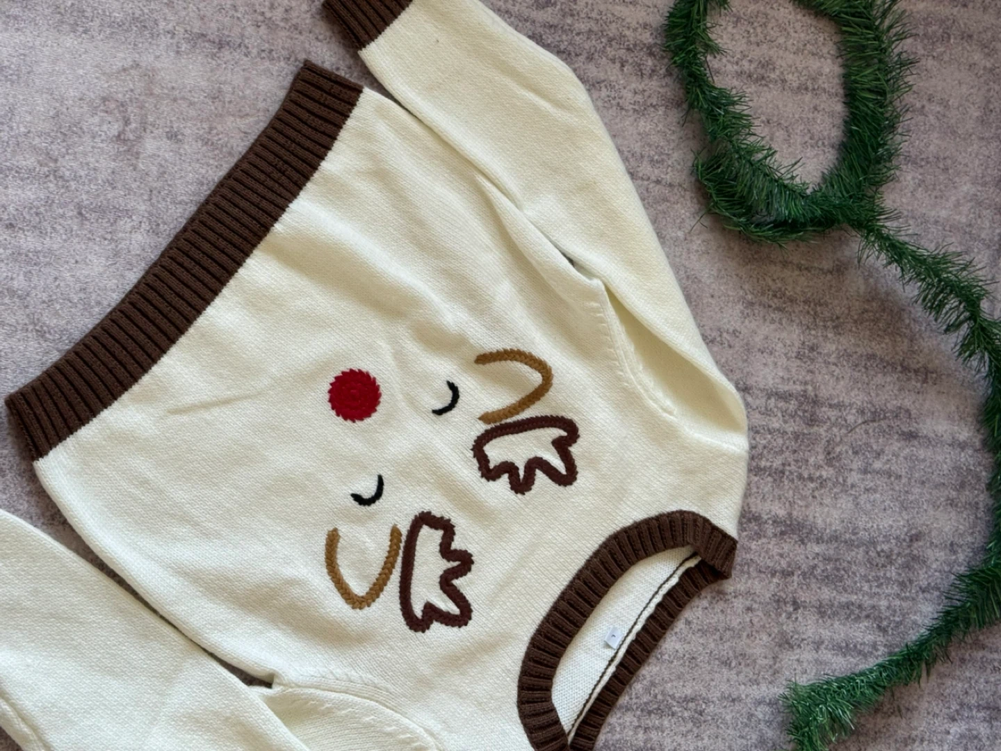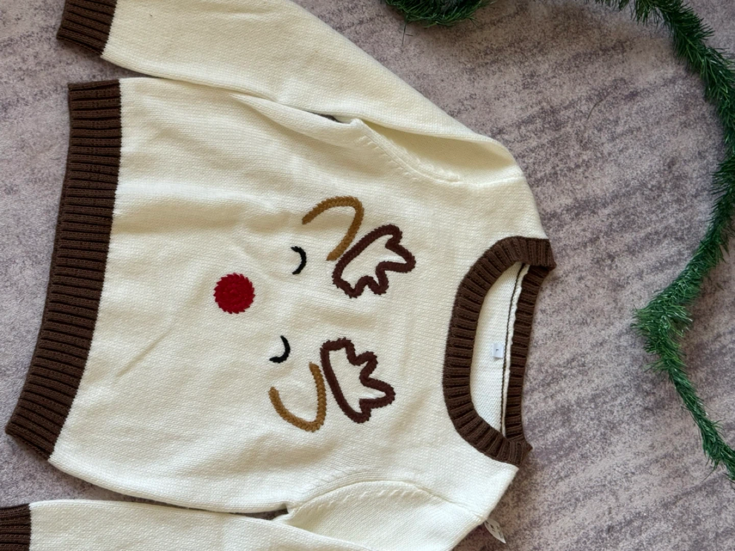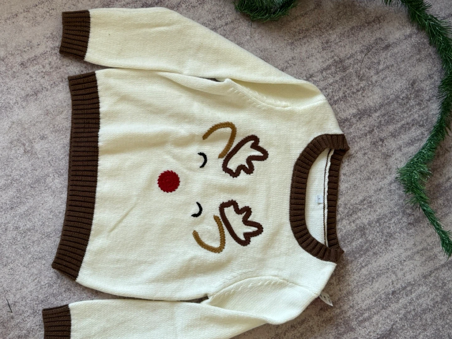 60Here's a cute reindeer sweater, perfect for the holidays! It features a cream-colored body with brown accents around the collar, cuffs, and hem. The reindeer face is embroidered on the front with a red nose and brown antlers