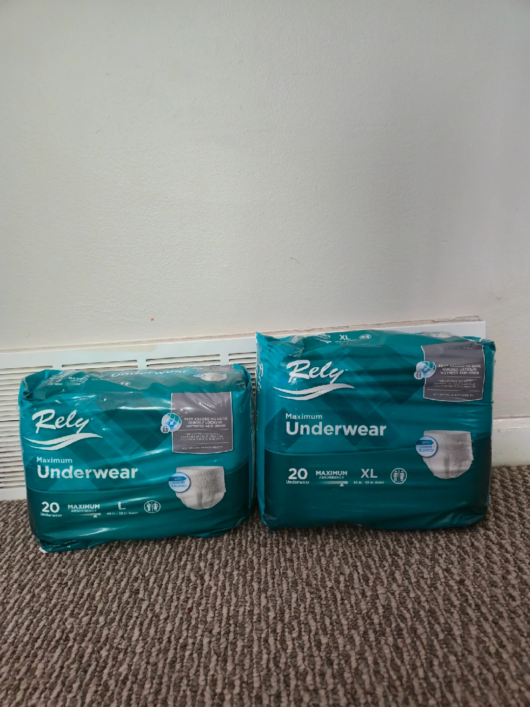 I have Rely Maximum Underwear in size XL. Each pack contains 20 underwear. These are designed for maximum absorbency and fit waist sizes 58-68 inches. They feature an odor guard and a fast-absorbing core to quickly lock in wetness and odor.. I have many bags of them.