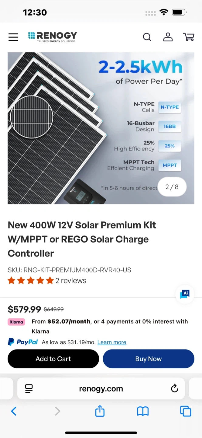Selling a new Renogy 400W 12V Solar Premium Kit with MPPT or REGO Solar Charge Controller. This kit is still in its original box. The SKU is RNG-KIT-PREMIUM400D-RVR40-US. High efficiency.