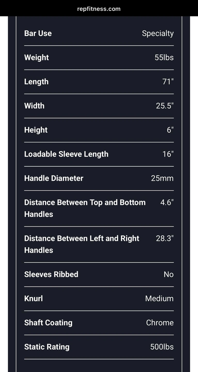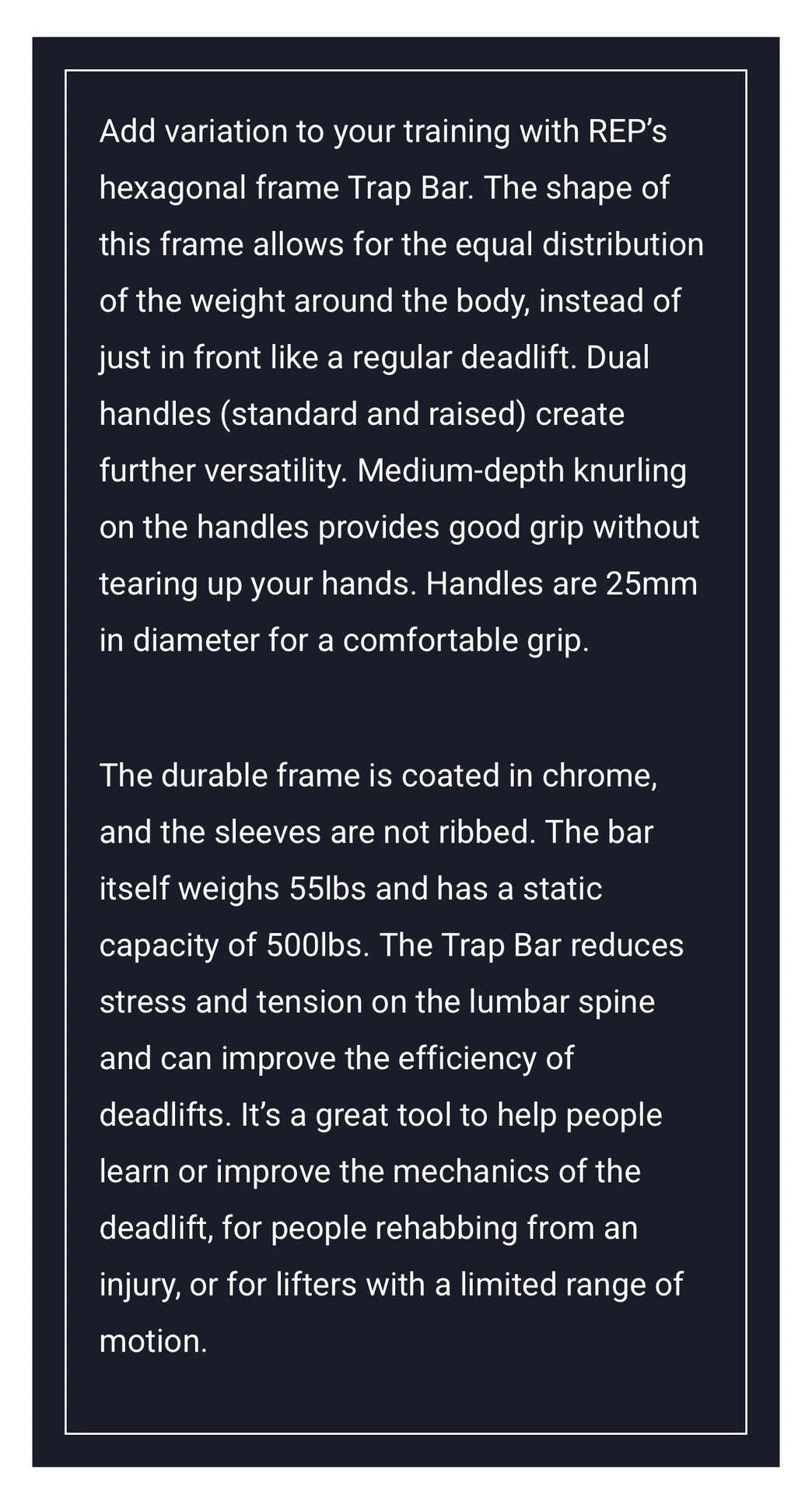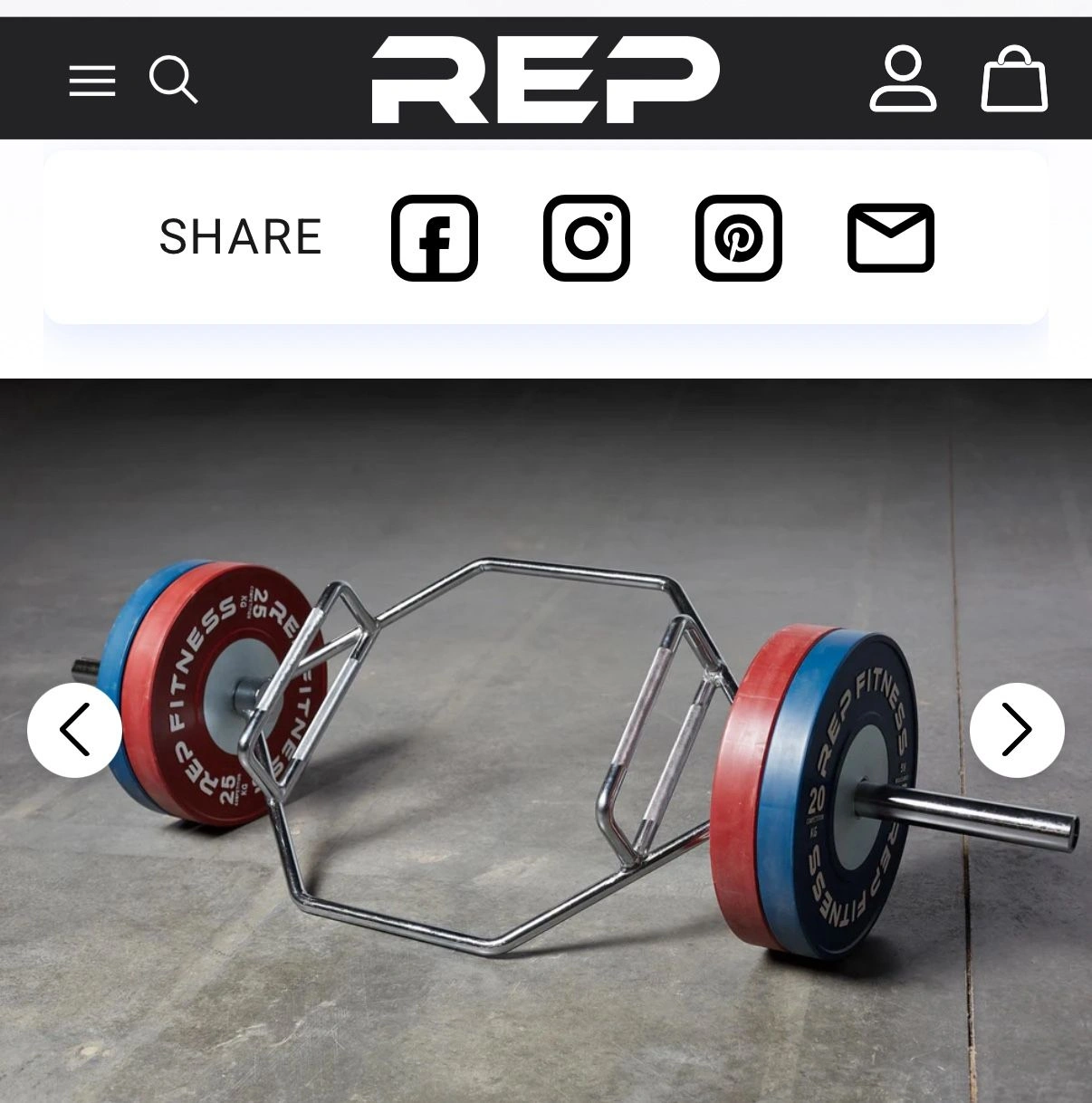15Rep Fitness Hex Bar in Pristine condition. Not a crappy Amazon/Walmart bar. This bar is capable of heavy loads and will not bend or snap on you. This bar has 16” sleeves and can handle more weight. Most normal trap bars have short sleeves. This one can handle more bumpers. Type: Olympic Brand: Rep Fitness