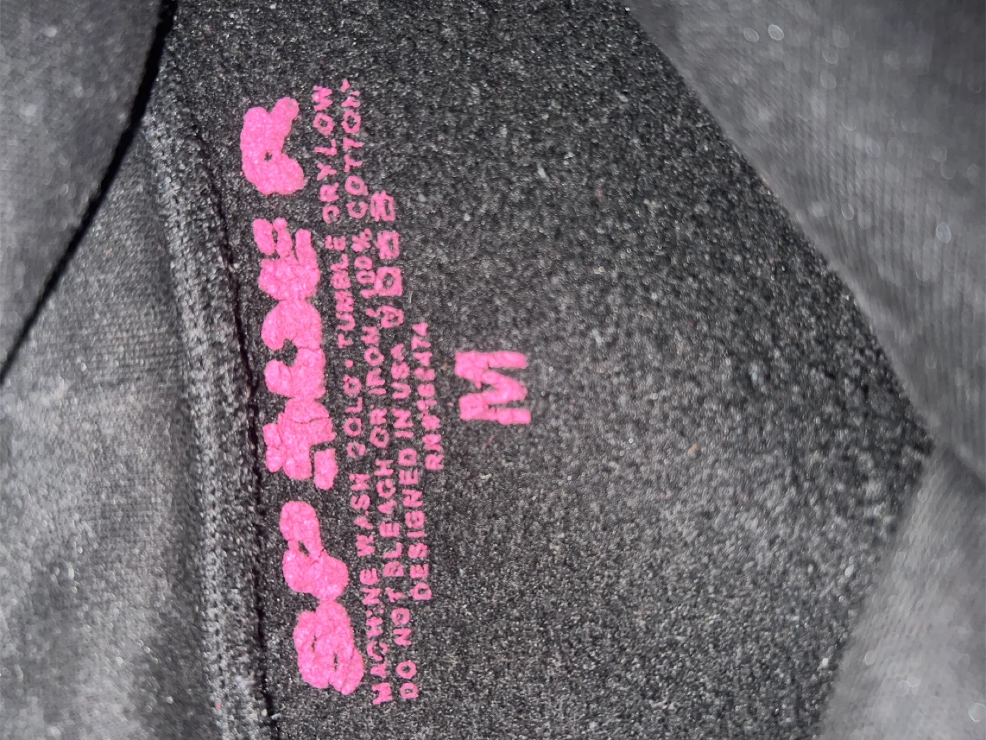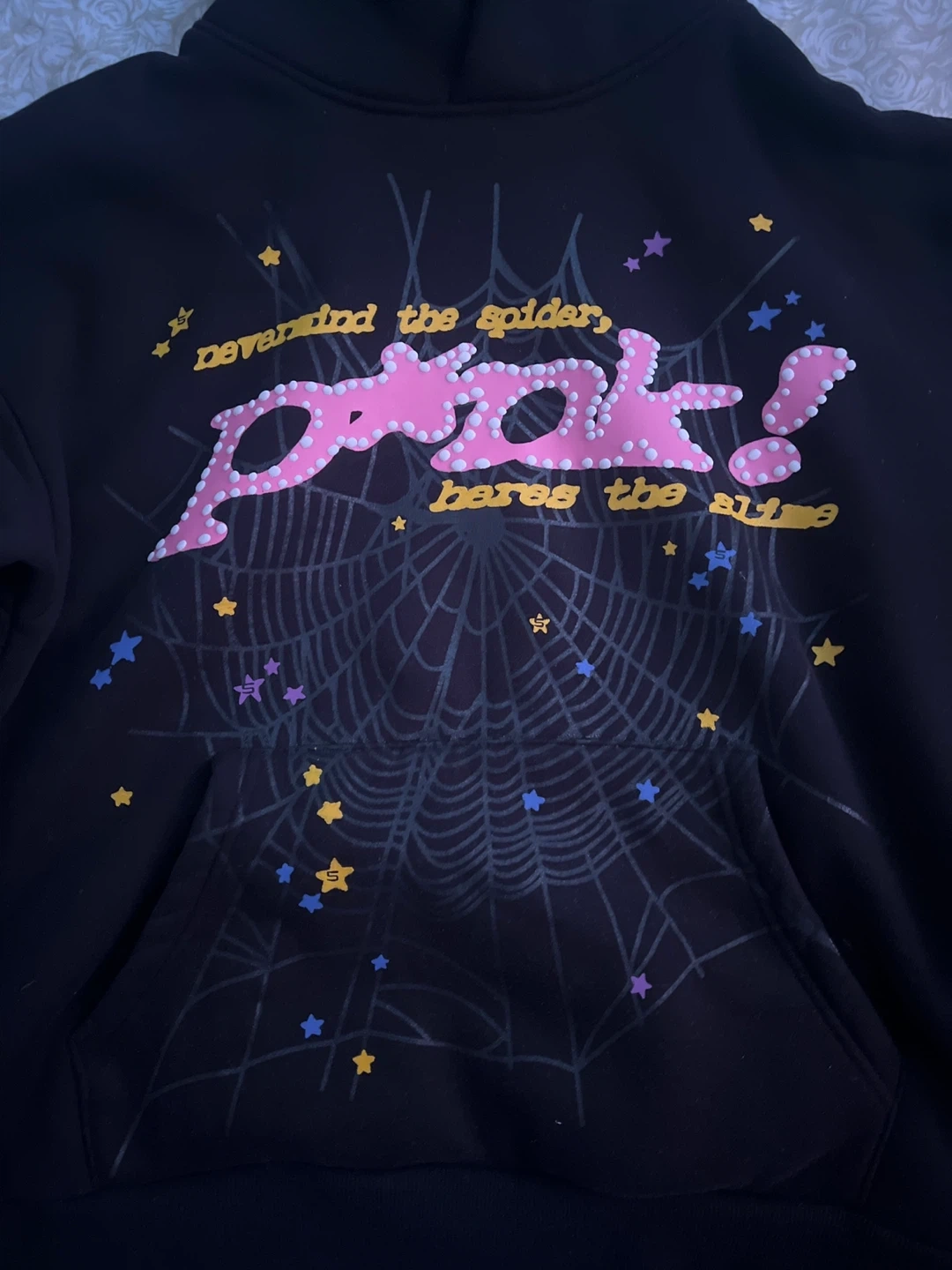 Selling a black Sp5der hoodie in size medium. It features a unique spiderweb design and the brand's logo. The material is 100% cotton. Machine wash cold and tumble dry low