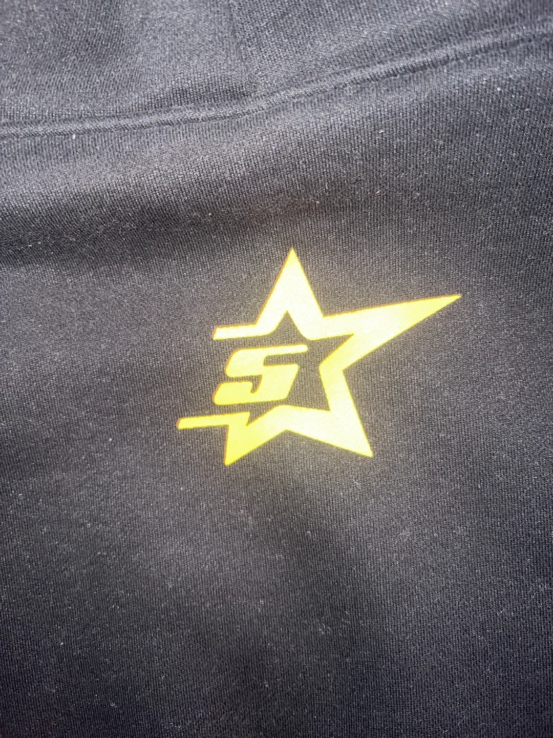 Selling a black Sp5der hoodie in size medium. It features a unique spiderweb design and the brand's logo. The material is 100% cotton. Machine wash cold and tumble dry low