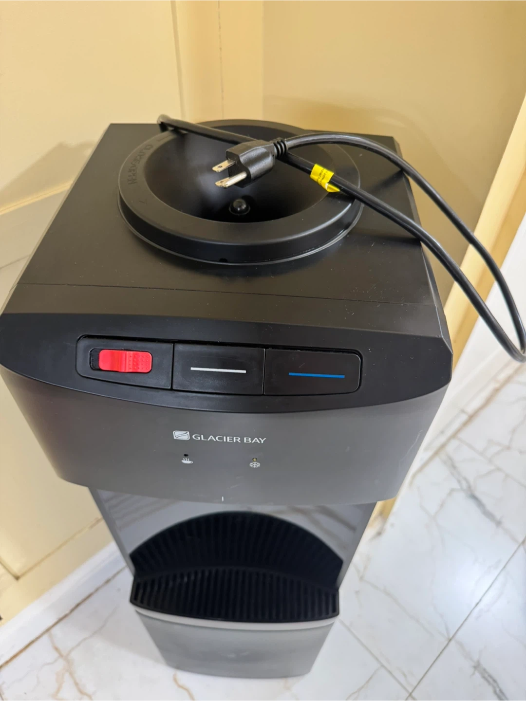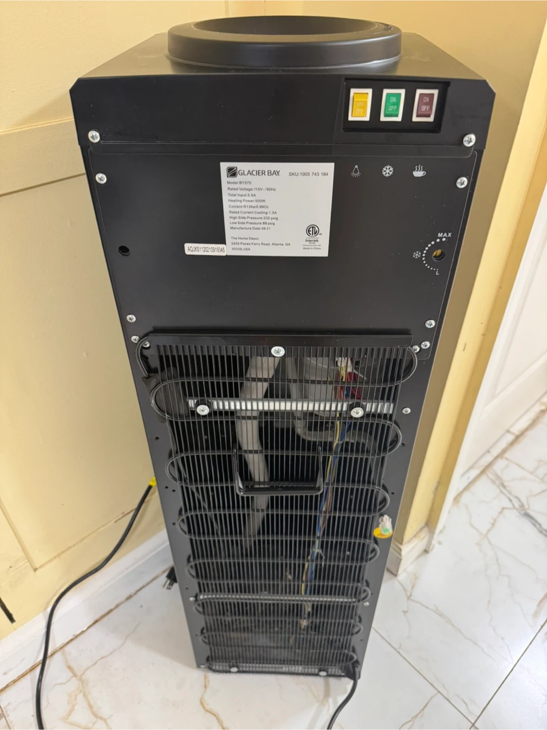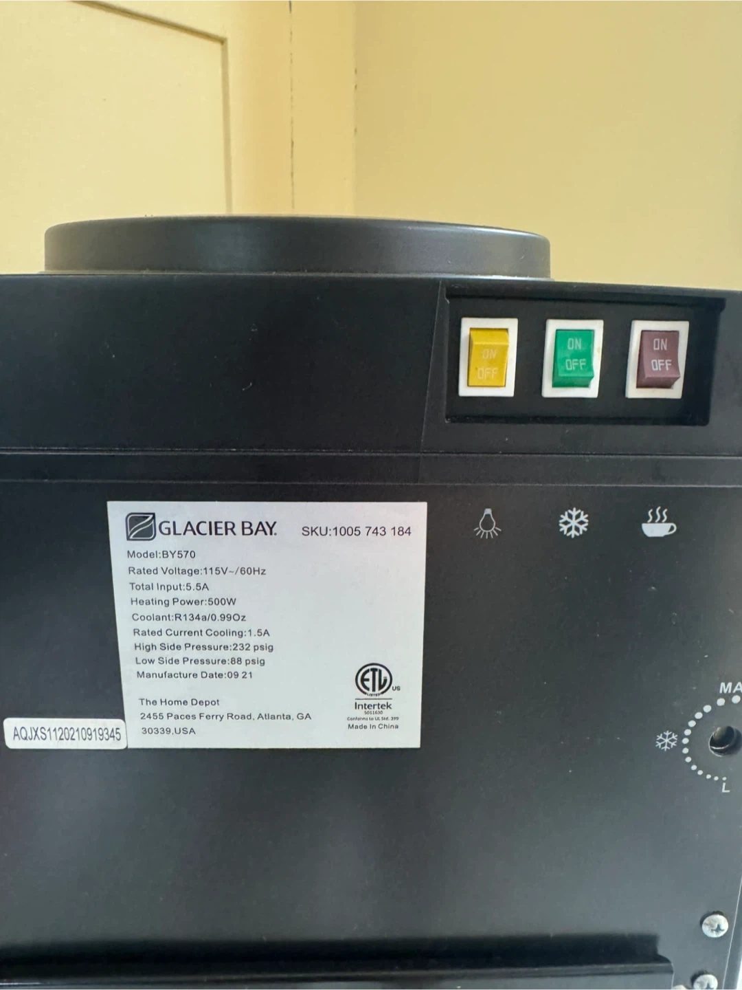 Glacier Bay water dispenser with cooling and heating functions. Model BY570. Features hot and cold water spouts. Rated Voltage: 115V.