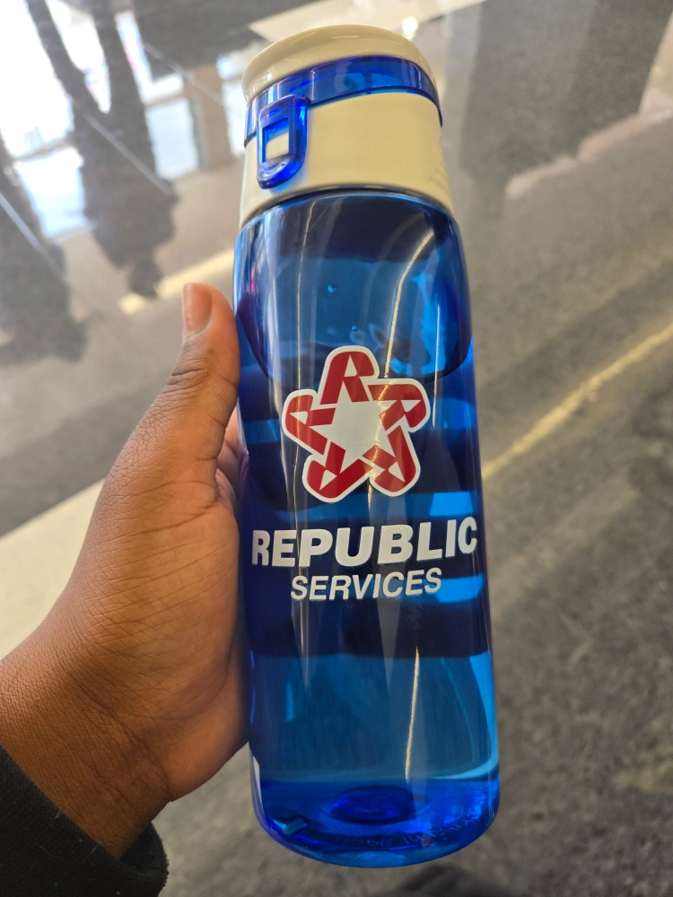 74Selling a blue water bottle with the Republic Services logo. It's in great condition and ready for a new owner!
