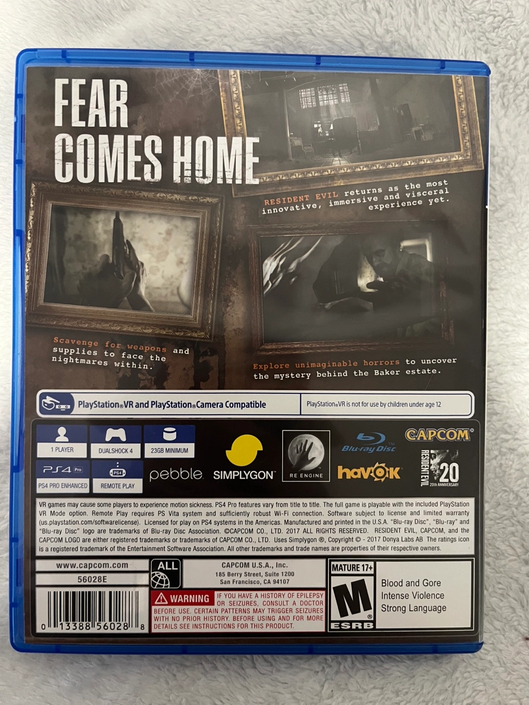 69Playstation 4 game. Includes Playstation VR mode. Mature 17+. Rated M for intense violence, blood and gore, and strong language. Explore unimaginable horrors. Uncover the mystery behind the Baker estate. Fear comes home.