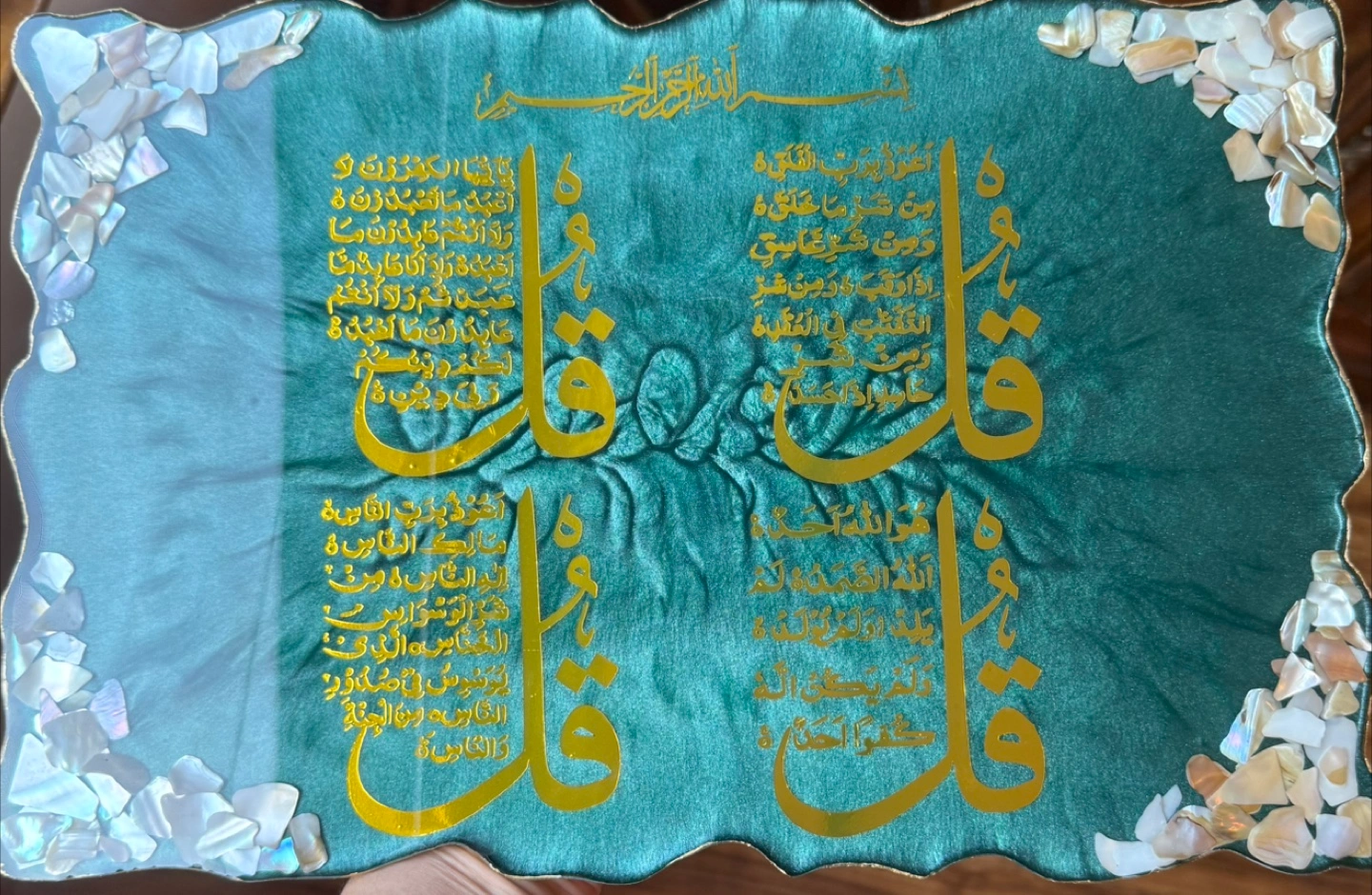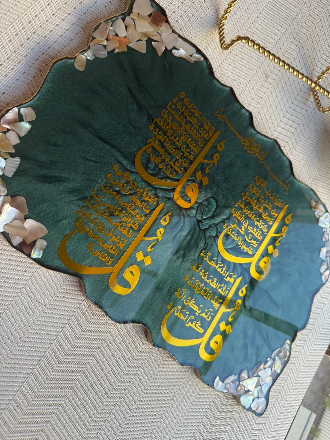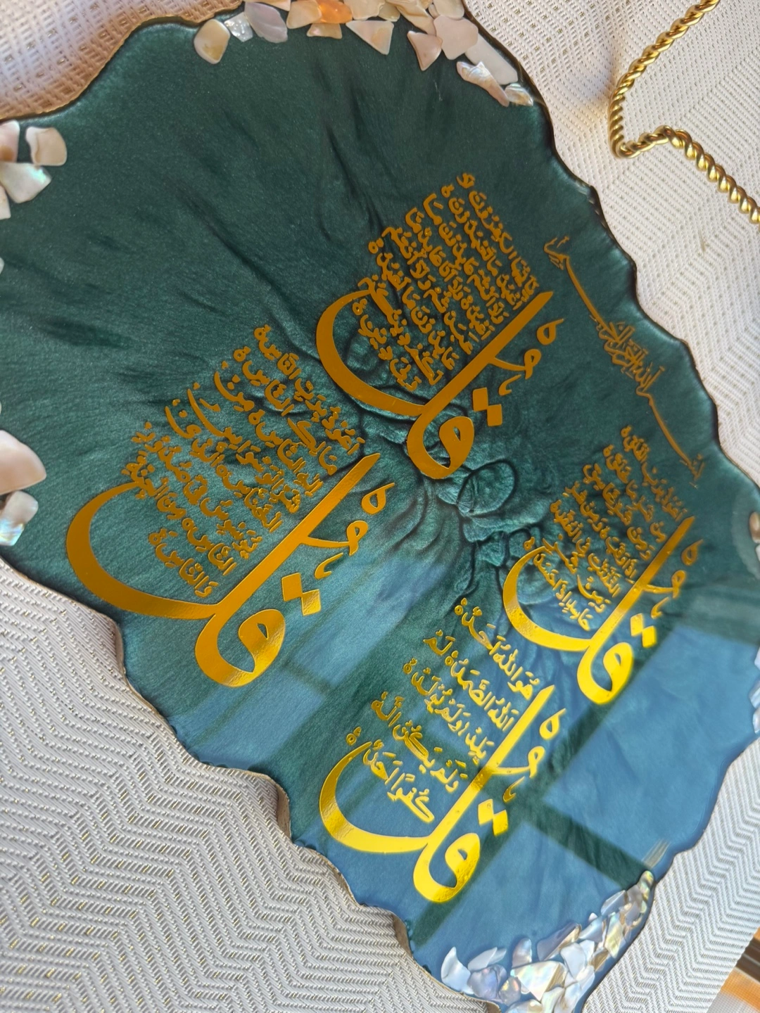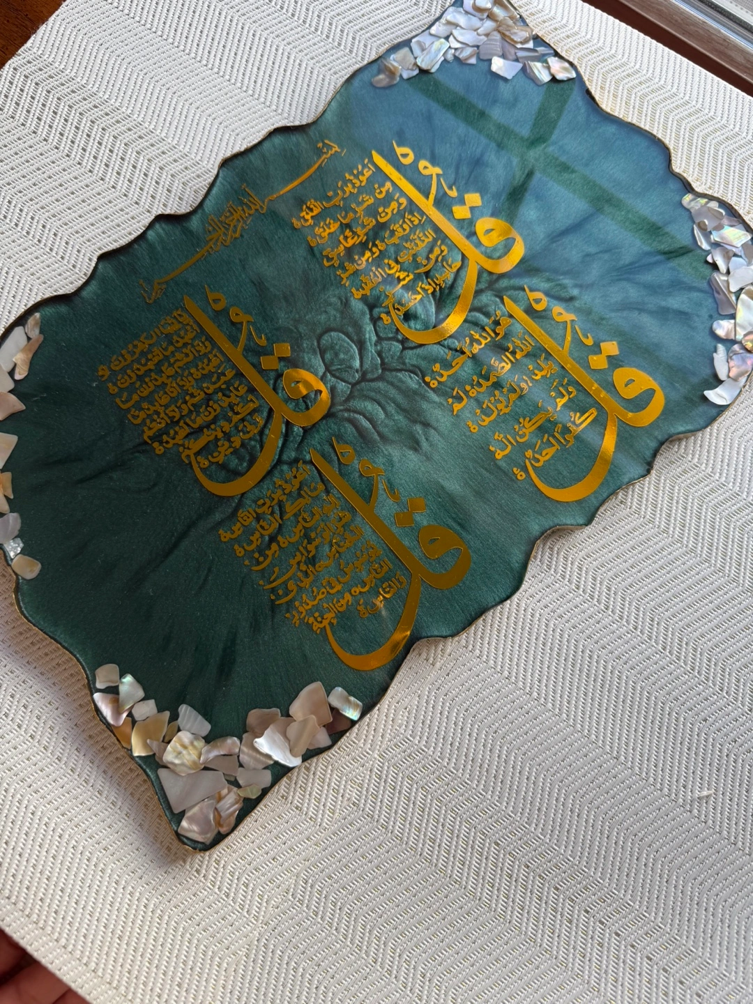 This is a beautiful resin art tray featuring Arabic calligraphy. It has a unique design with what appears to be crushed mother of pearl around the edges. It would make a lovely decorative piece!