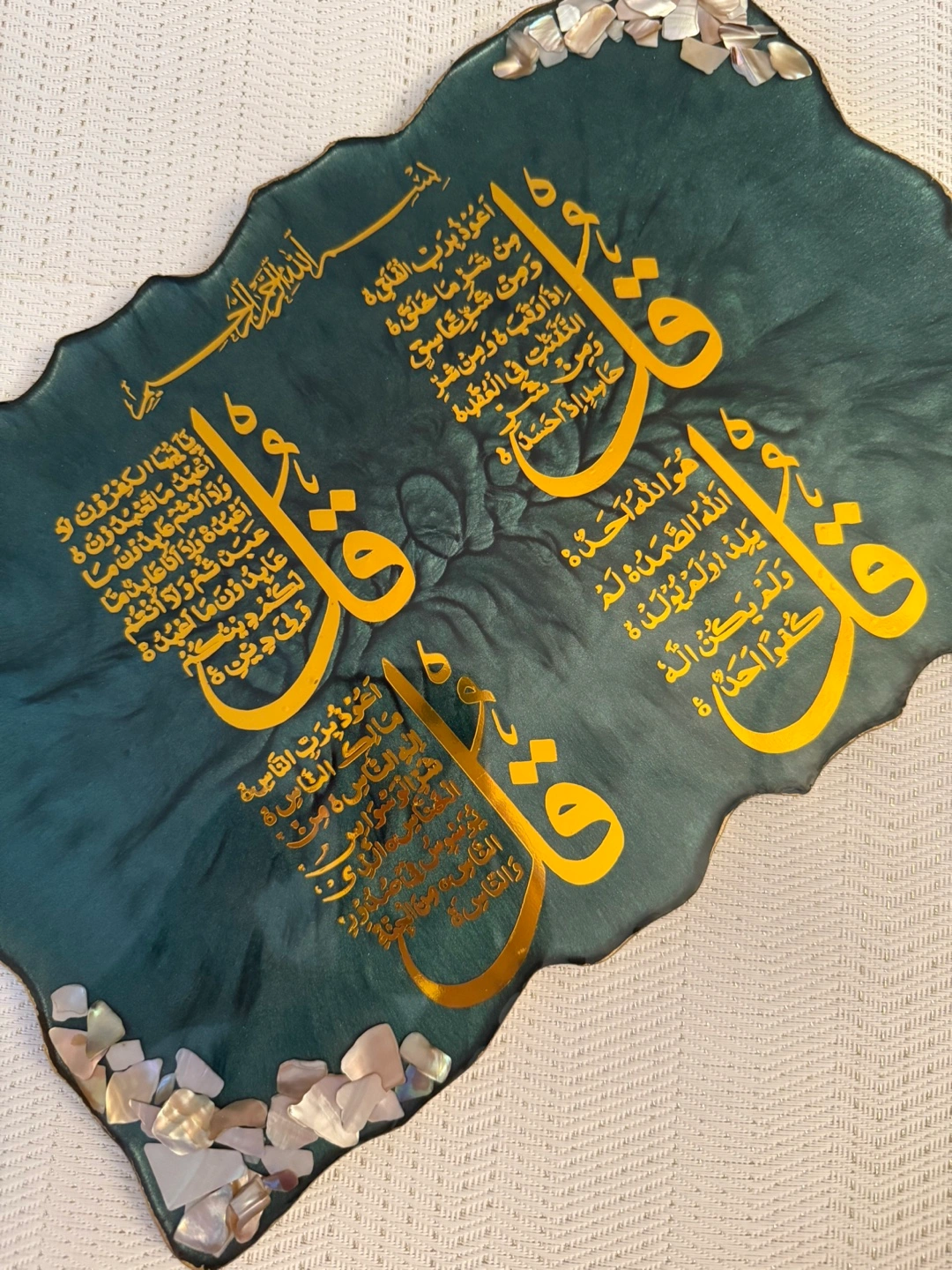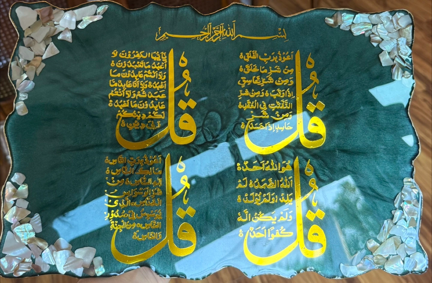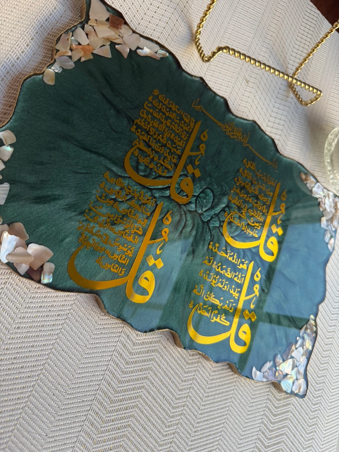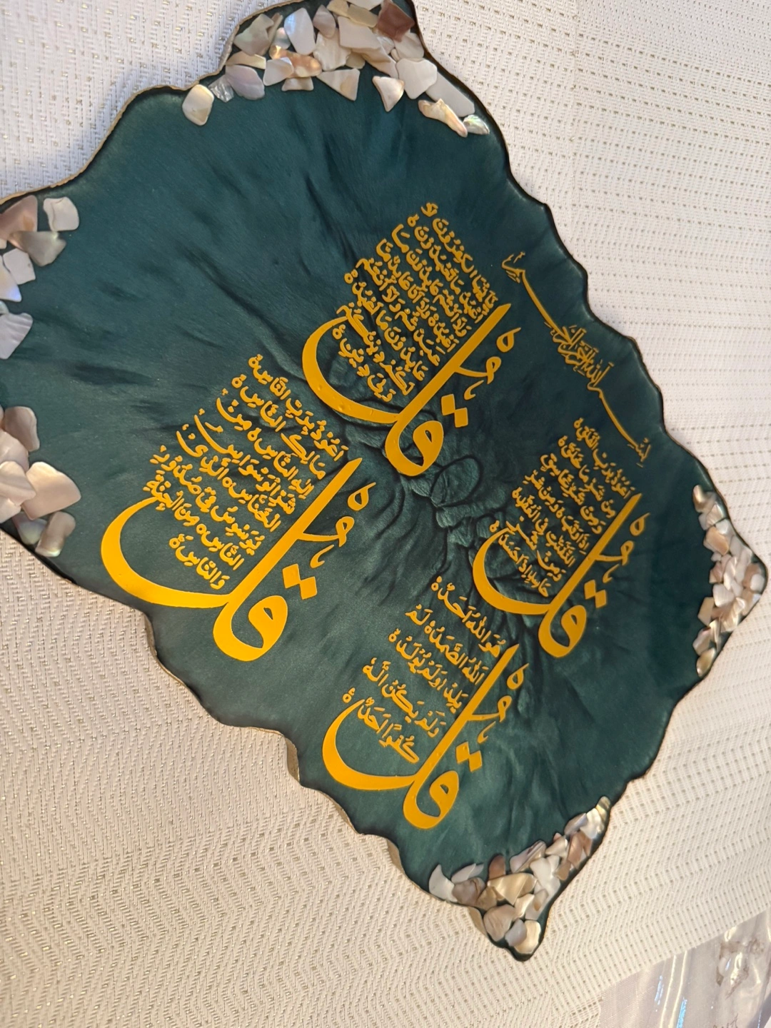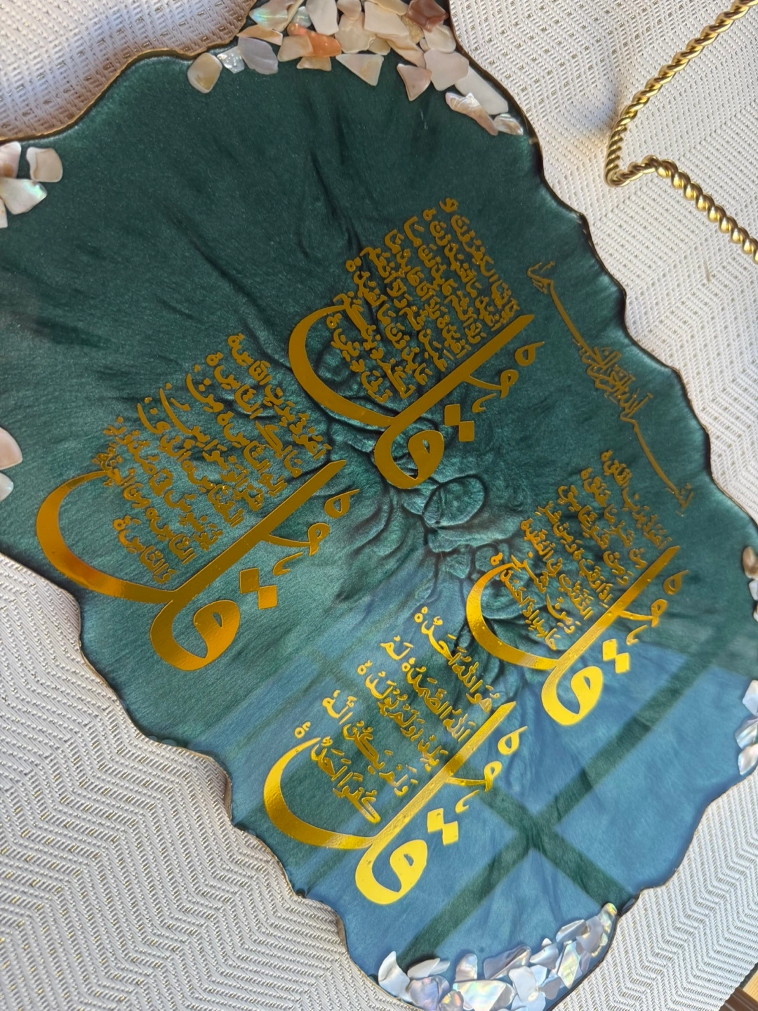 This is a beautiful resin art tray featuring Arabic calligraphy. It has a unique design with what appears to be crushed mother of pearl around the edges. It would make a lovely decorative piece!