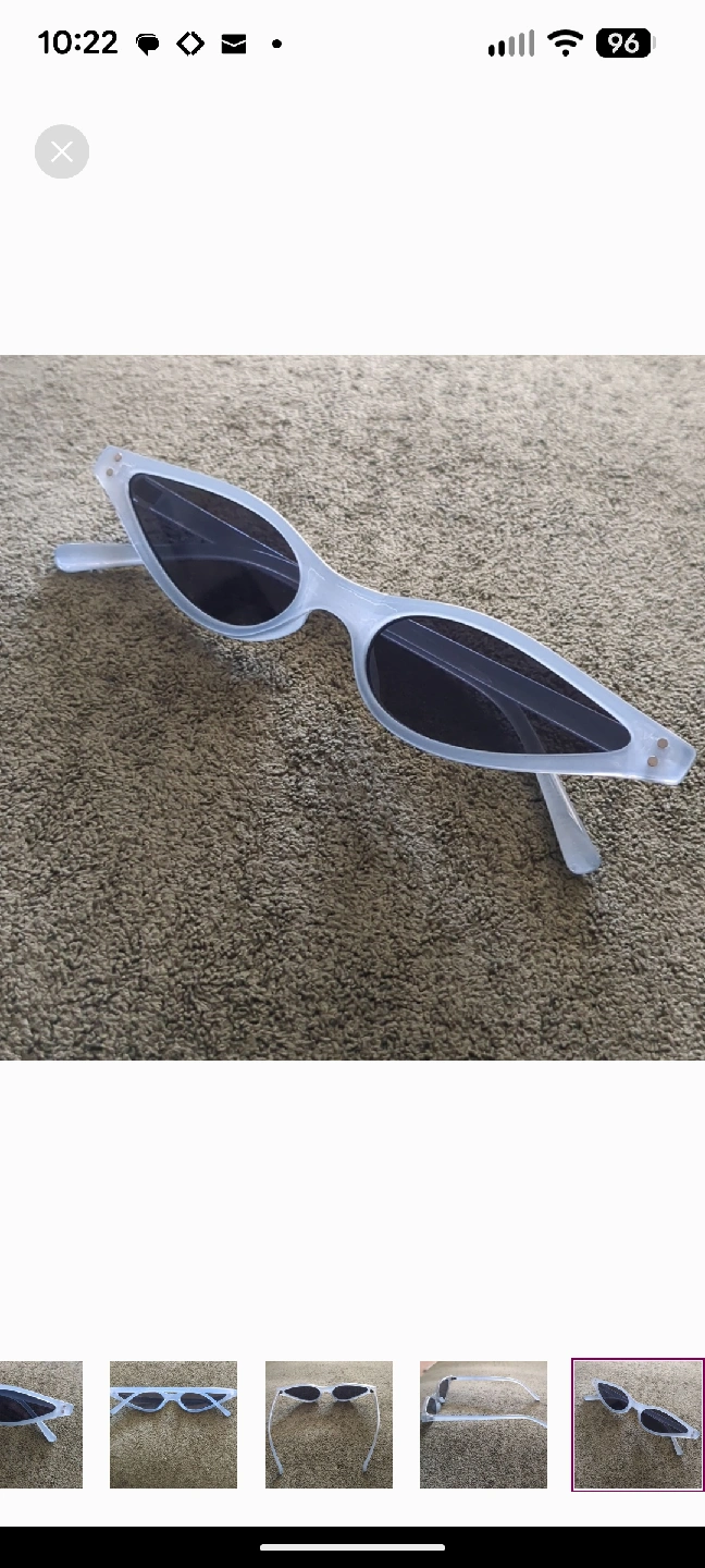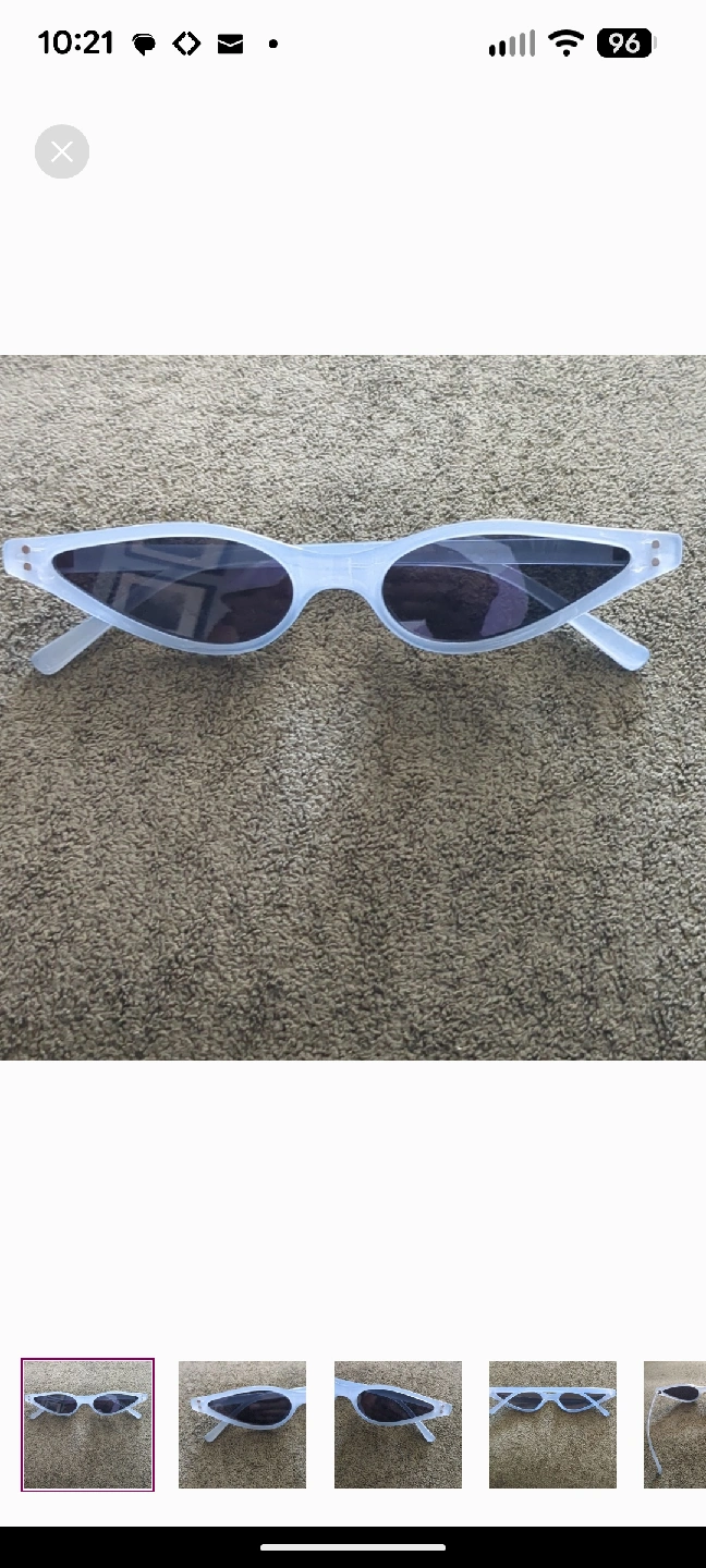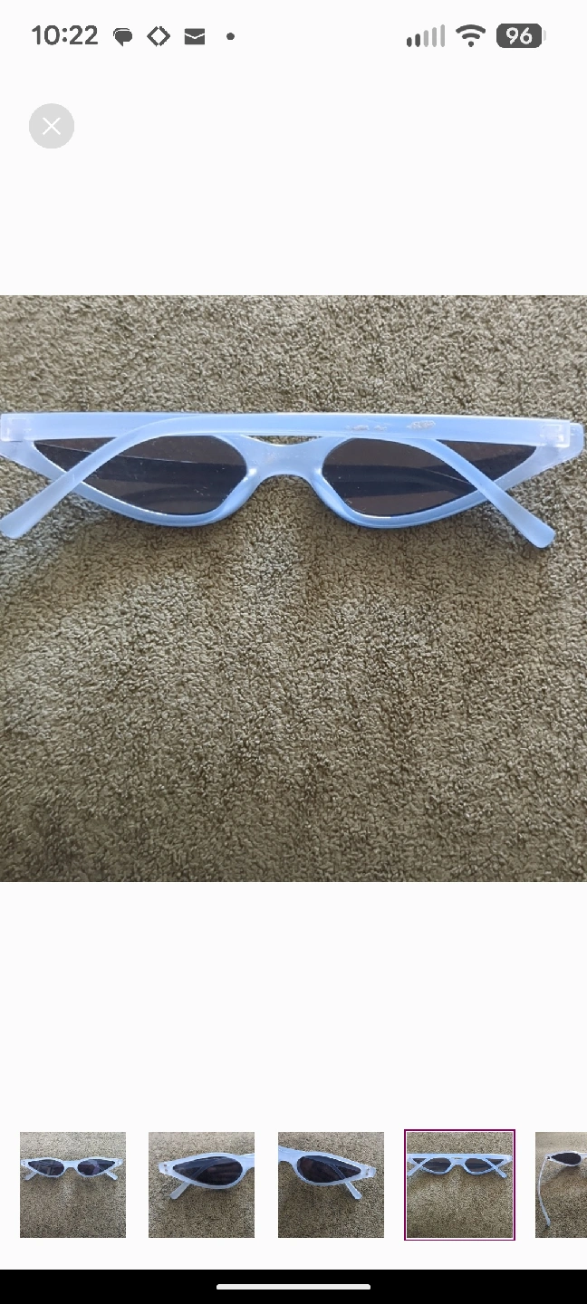 Elevate your look with these on-trend sunglasses featuring an ultra-slim, extreme cat-eye shape. The striking design has a strong 90s vintage or retro-futuristic vibe, making them a perfect statement piece. The frames are a chic frosted blue finish, paired with dark tinted lenses. They're the ultimate accessory for festivals, street style looks, or adding a high-fashion edge to your everyday outfit. EXCELLENT PRE-OWNED CONDITION