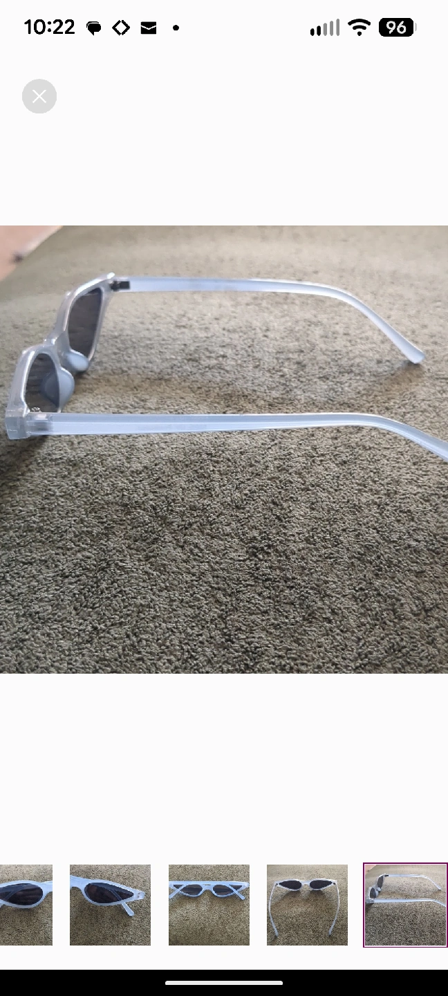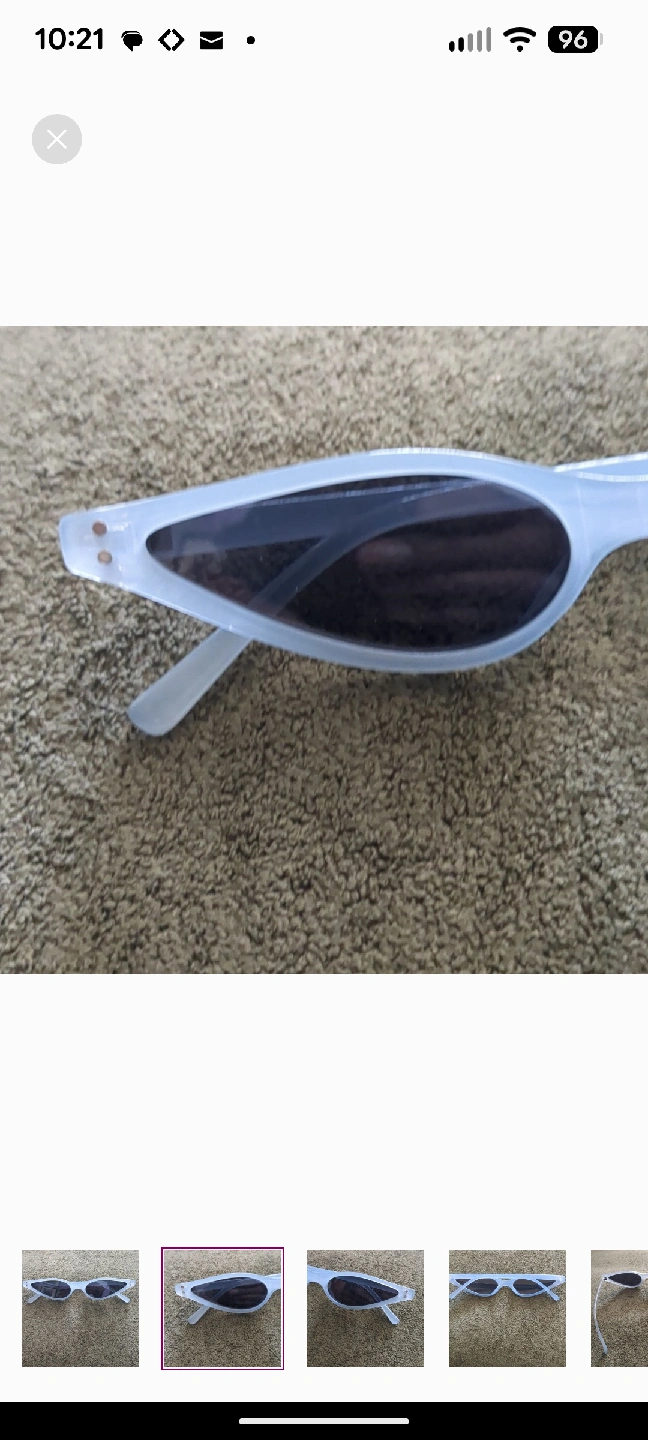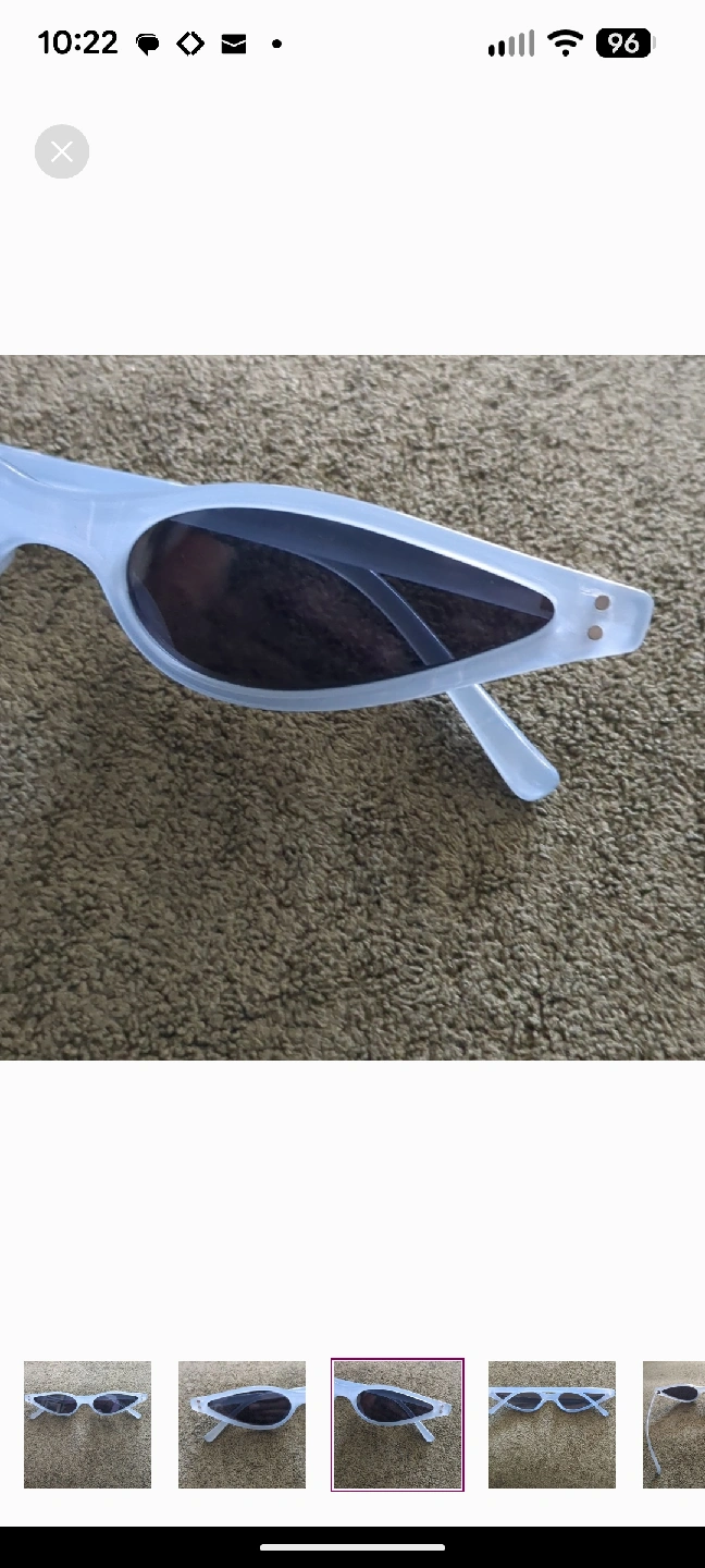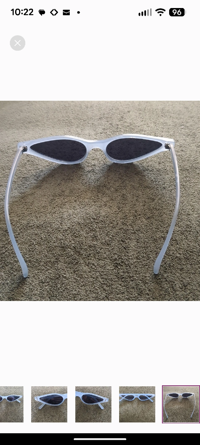 Elevate your look with these on-trend sunglasses featuring an ultra-slim, extreme cat-eye shape. The striking design has a strong 90s vintage or retro-futuristic vibe, making them a perfect statement piece. The frames are a chic frosted blue finish, paired with dark tinted lenses. They're the ultimate accessory for festivals, street style looks, or adding a high-fashion edge to your everyday outfit. EXCELLENT PRE-OWNED CONDITION