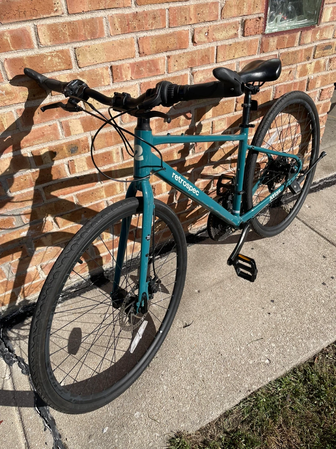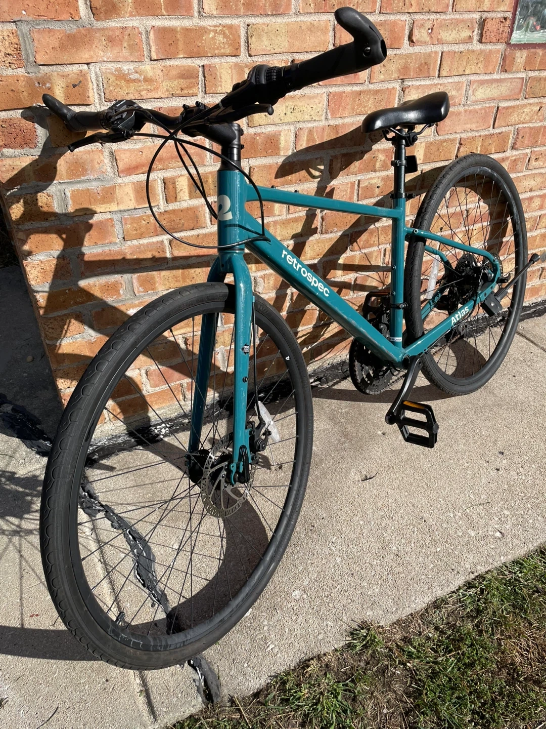 65Retrospect hybrid bike Tuned up 16” aluminum frame Good for riders 5,4 to 5,9 All weather mechanical discs brakes 3x7 drivetrain 21 speeds Shimano components 700 double wall alloy rims Sport comfort saddle Quick release wheels Accessories include- kickstand and light reflectors First come first serve