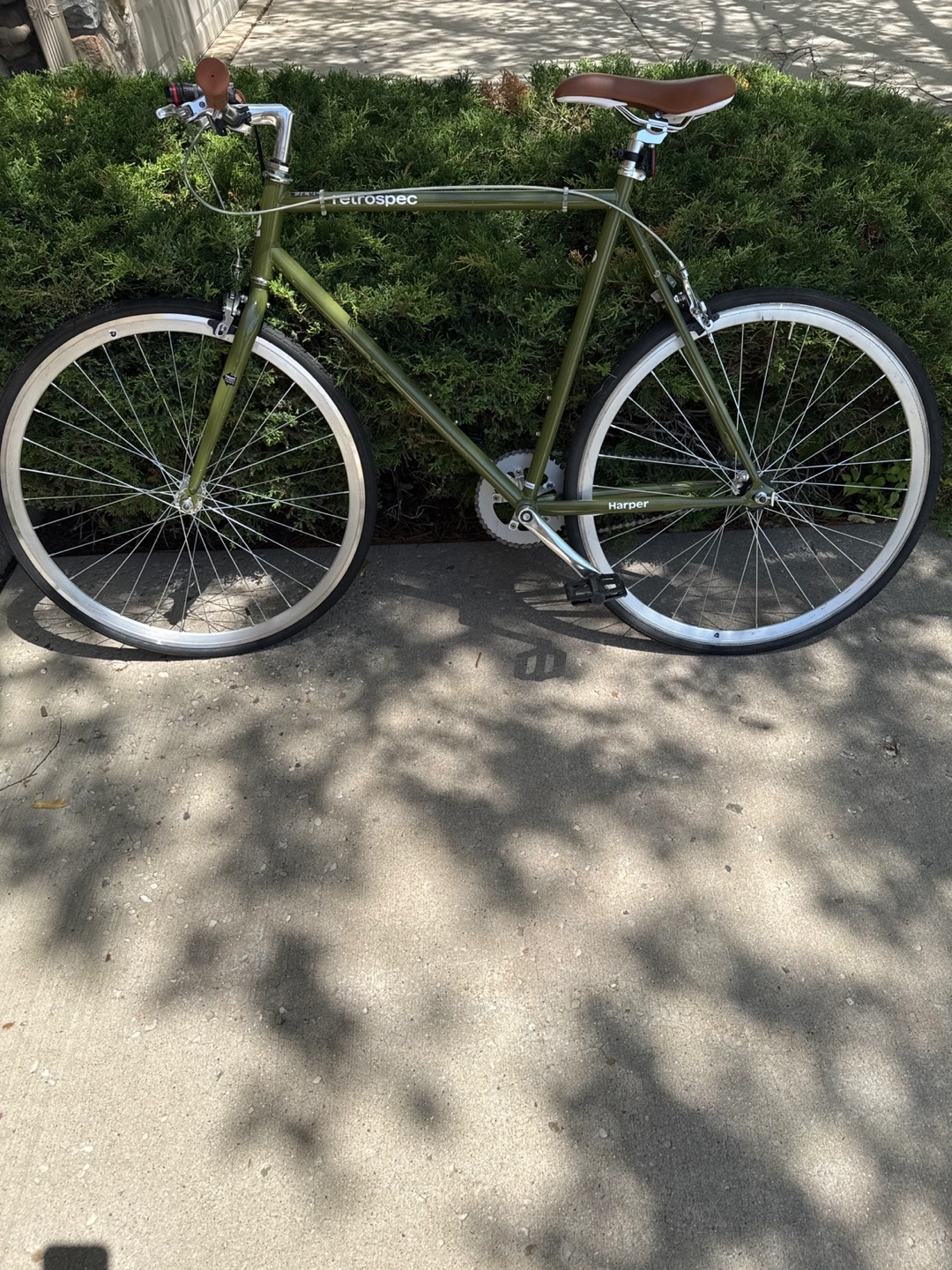 31Retrospec Harper single speed bicycle. Olive green frame. 700c wheels. Good condition.