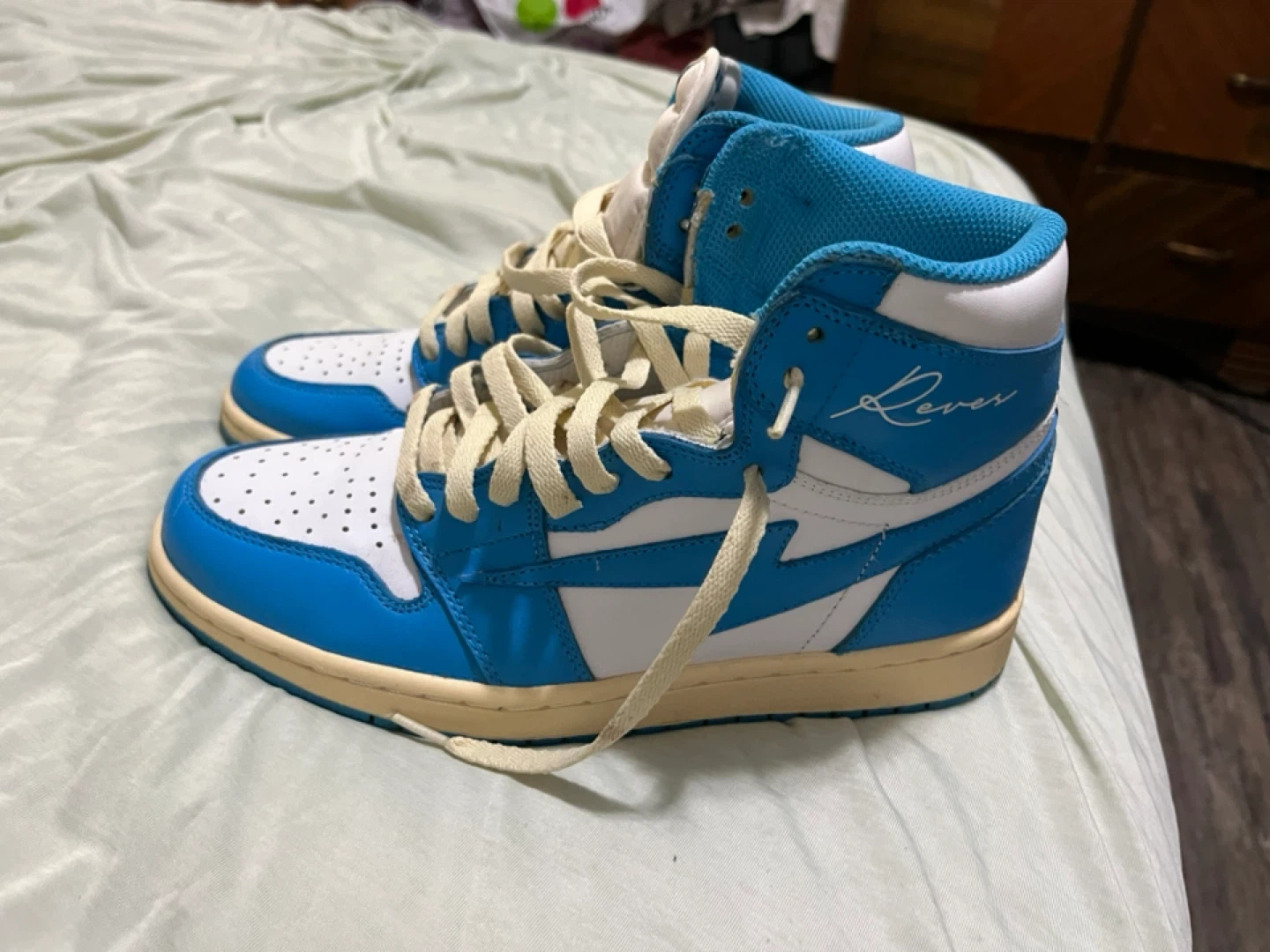65Selling a pair of Rever high-top sneakers in blue and white. They have a stylish design and are in good condition. Perfect for adding a pop of color to your outfit!