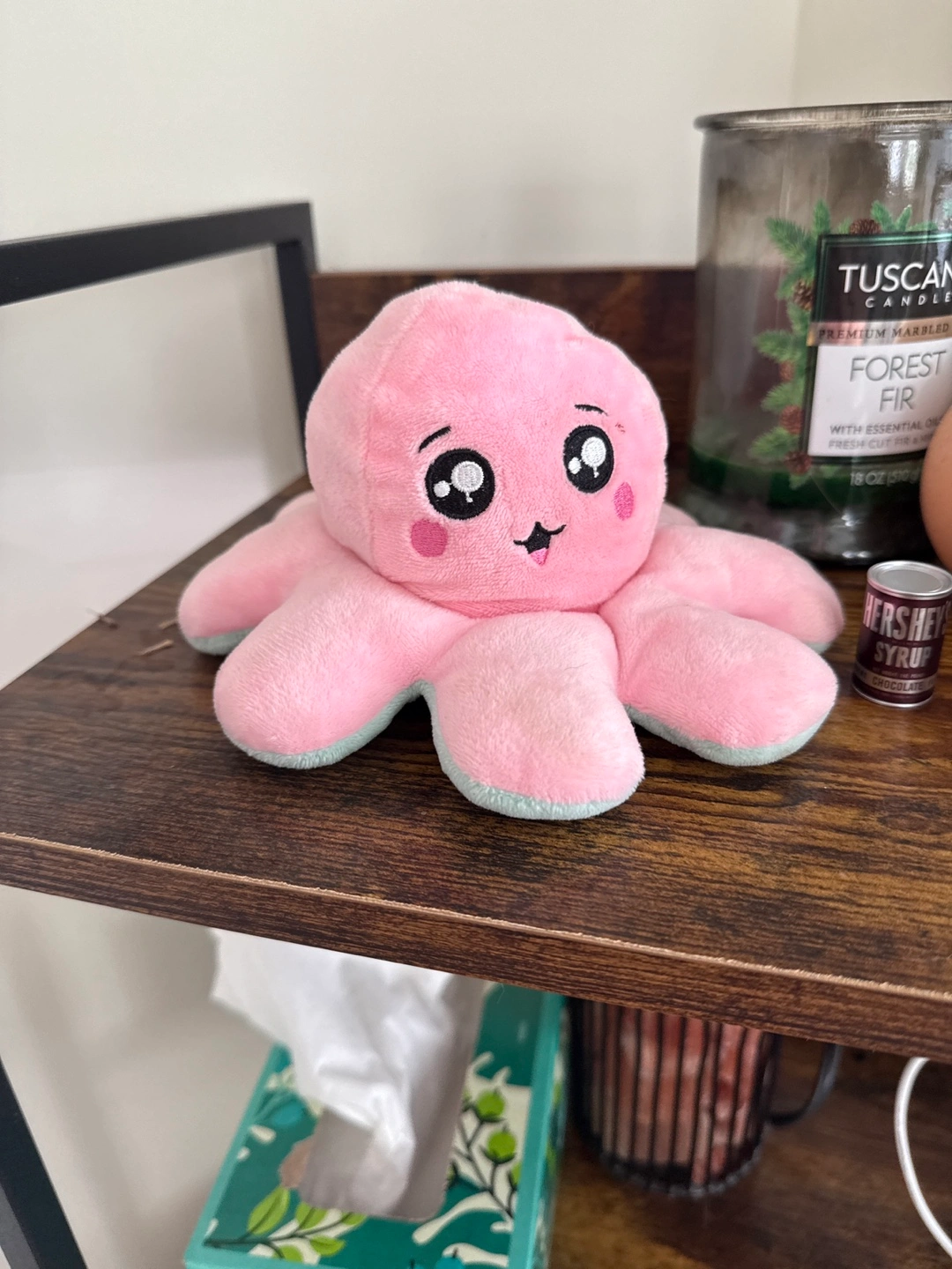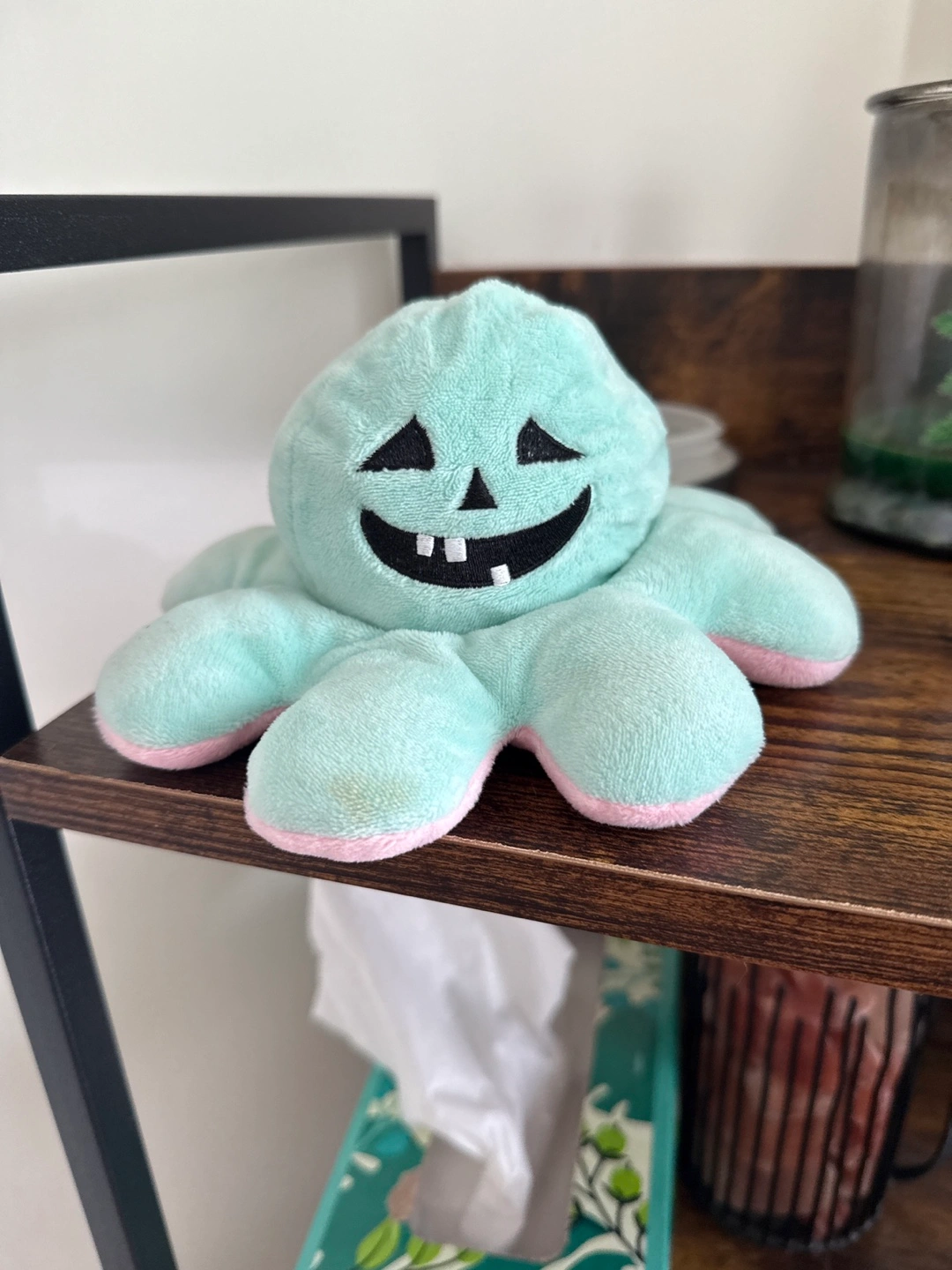 Super cute reversible octopus plushie! One side is a light blue-green pumpkin face and the other is a happy pink face. It's in good condition and ready for a new home!