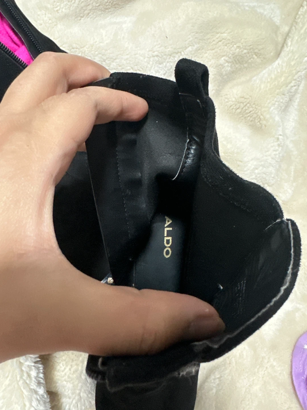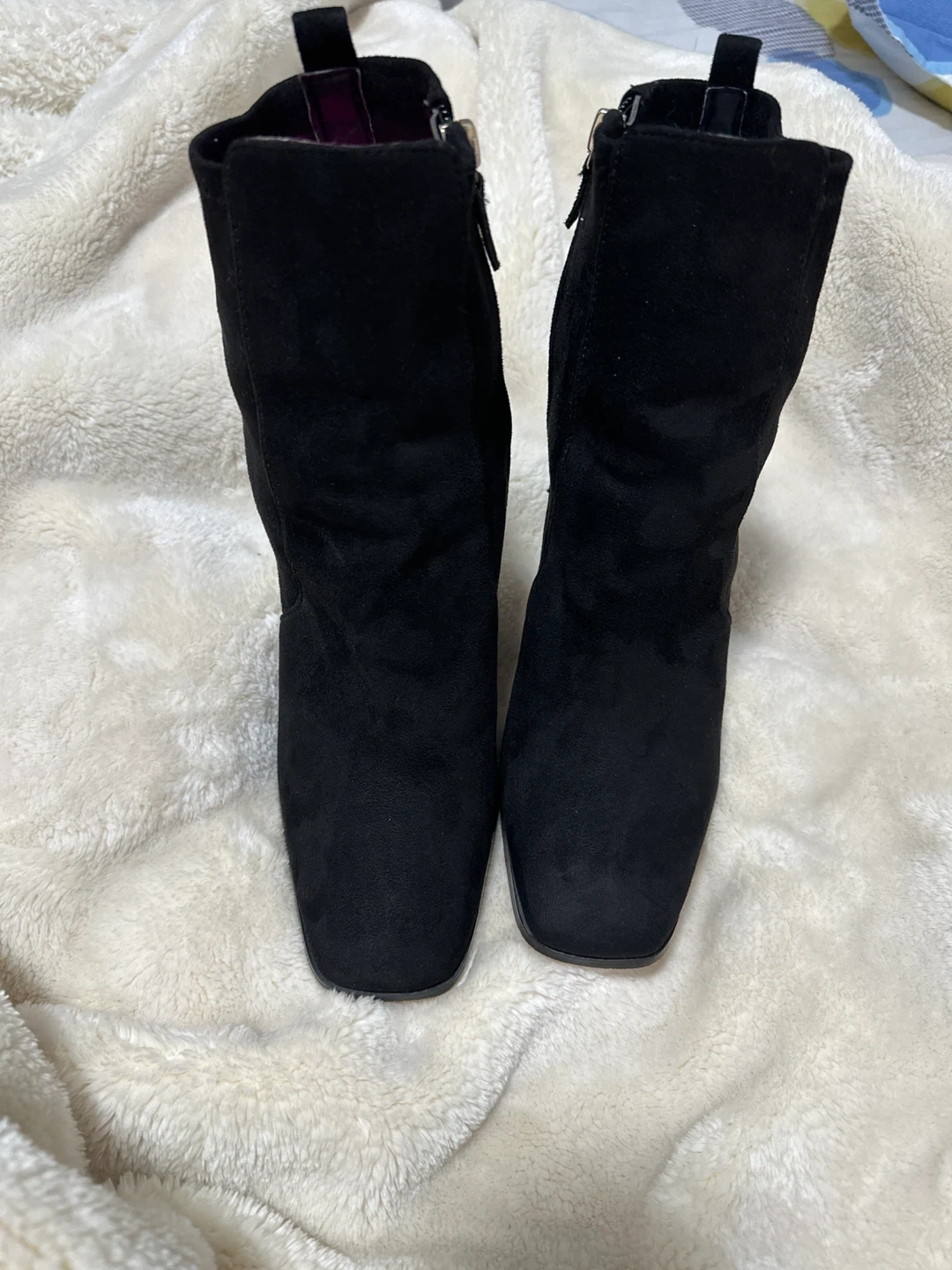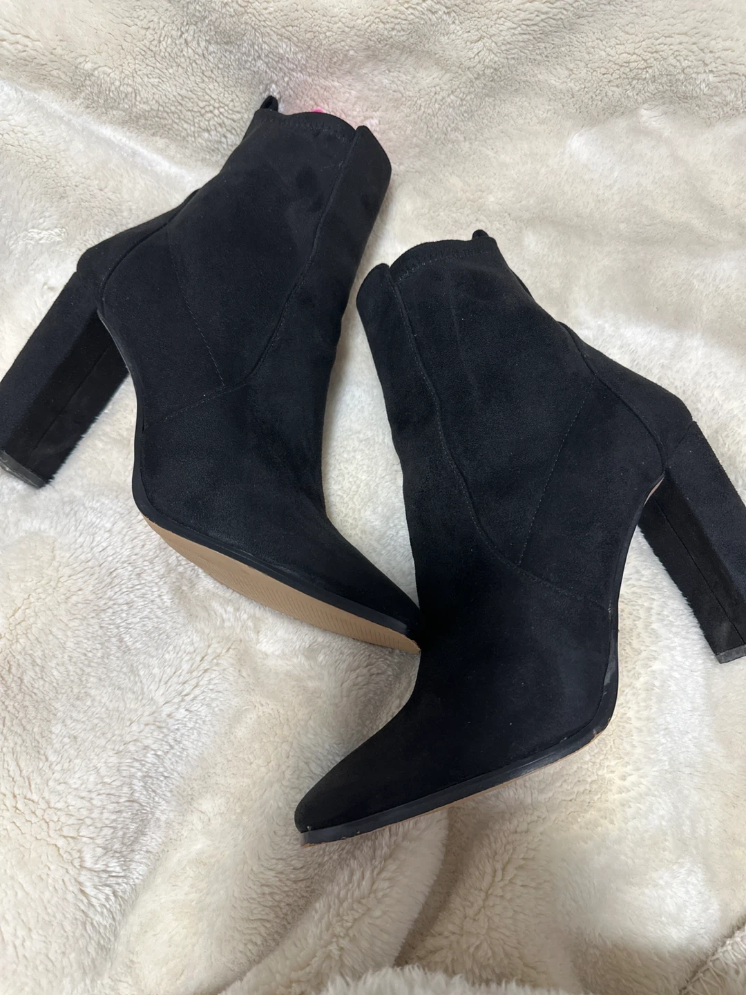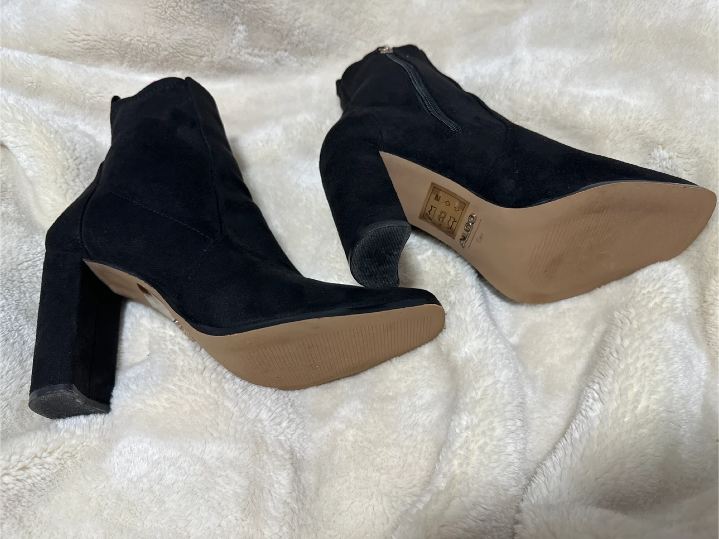 Stylish black suede ankle boots from ALDO. These feature a pointed toe and a side zipper for easy on and off. Comfortable block heel for all-day wear!