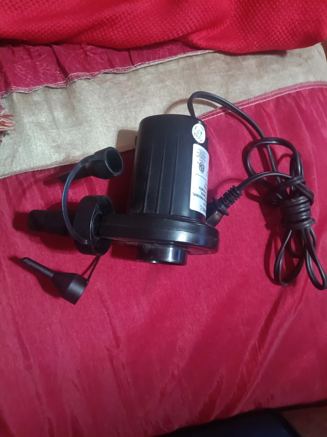 This is a black electric air pump for inflatables. It comes with multiple nozzle attachments for different valves. Lightweight and portable, it's great for quickly inflating air mattresses and toys!